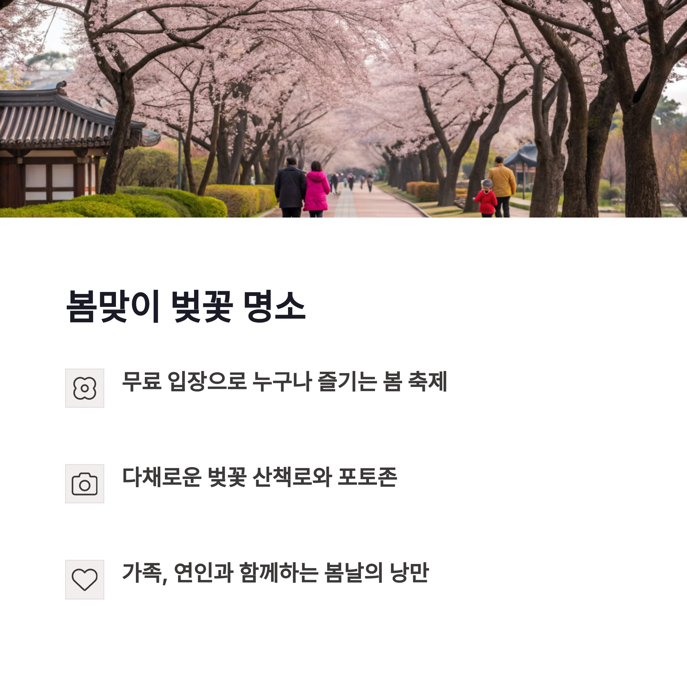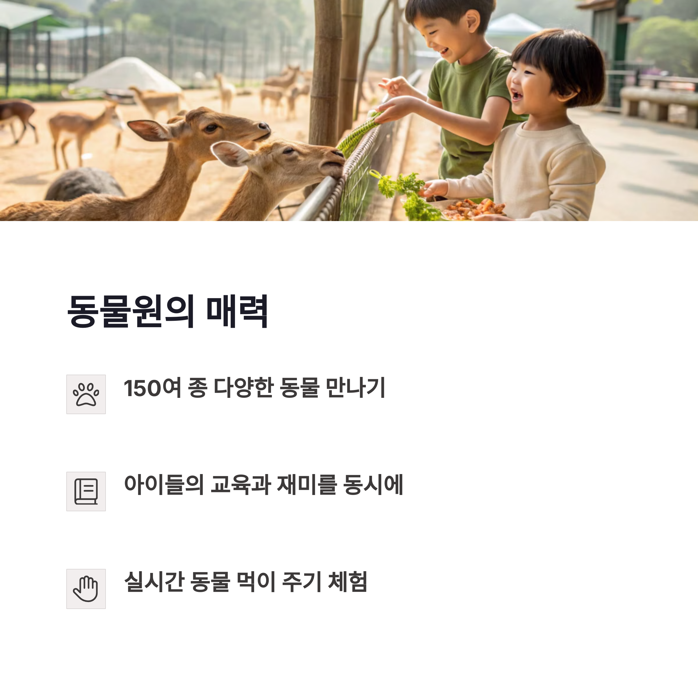 | 동물원, 놀이시설, 자연 체험 등 다양한 구성 | 벚꽃, 버스킹, 체험부스 등 계절별 이벤트 풍성 | 아이부터 어른까지 모두 만족하는 나들이 명소 |