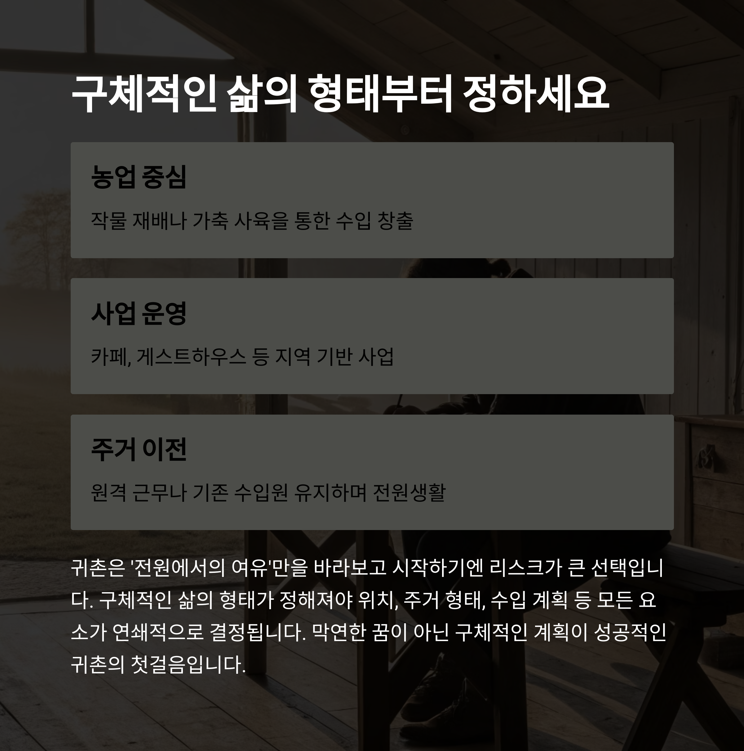 귀촌은 ‘전원에서의 여유’만을 바라보고 시작하기엔 리스크가 큰 선택입니다. 농업을 할 건지, 카페나 게스트하우스를 운영할 건지, 혹은 단순한 주거 이전인지부터 확실히 정해두는 게 중요합니다. 이게 정해져야 위치, 주거 형태, 수입 계획 등 모든 요소가 연쇄적으로 결정되기 때문입니다. 막연한 꿈이 아니라 구체적인 계획을 먼저 세워야 다음 단계가 수월해집니다.