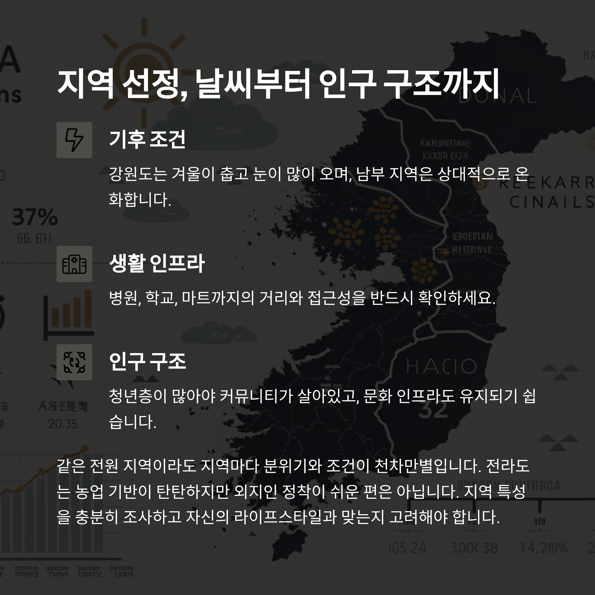 같은 전원 지역이라도 지역마다 분위기와 조건이 천차만별입니다. 강원도는 겨울이 춥고 눈이 많이 오며, 전라도는 농업 기반이 탄탄하지만 외지인 정착이 쉬운 편은 아닙니다. 교통, 병원, 학교, 마트까지의 거리도 살펴봐야 합니다. 해당 지역의 인구 구조나 고령화 수준도 확인해야 합니다. 청년층이 많아야 커뮤니티가 살아 있고, 문화 인프라도 유지되기 쉽습니다.