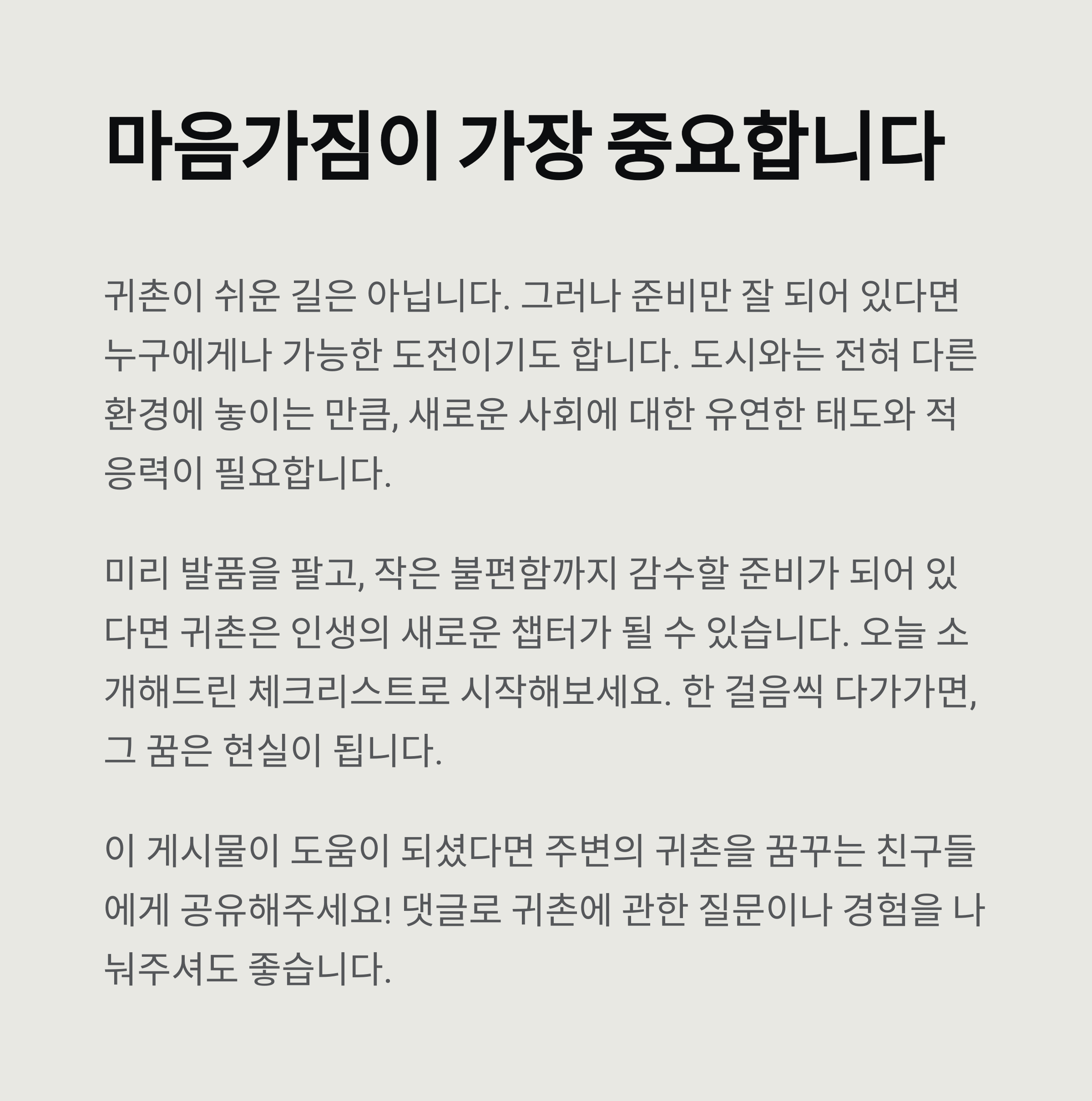 귀촌이 쉬운 길은 아닙니다. 그러나 준비만 잘 되어 있다면 누구에게나 가능한 도전이기도 합니다. 도시와는 전혀 다른 환경에 놓이는 만큼, 새로운 사회에 대한 유연한 태도와 적응력도 필요합니다. 미리 발품을 팔고, 작은 불편함까지 감수할 준비가 되어 있다면 귀촌은 인생의 새로운 챕터가 될 수 있습니다. 오늘 체크리스트로 시작해보세요. 한 걸음씩 다가가면, 그 꿈은 현실이 됩니다.