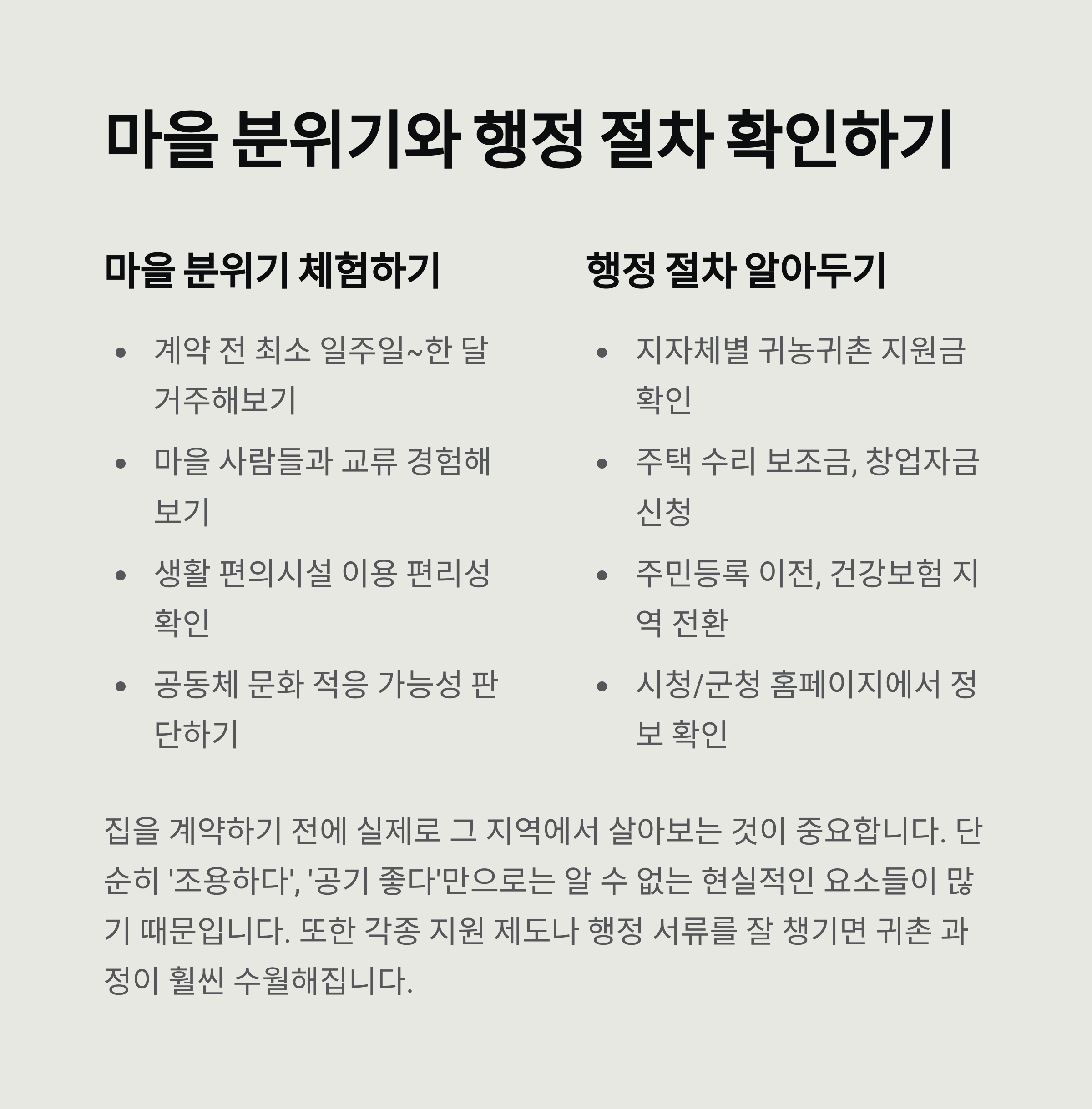집을 계약하기 전에 최소한 일주일에서 한 달 정도는 그 지역에서 살아보는 것을 추천합니다. 마을 사람들과의 교류, 생활 편의시설 이용, 날씨와 교통 등을 실제로 겪어봐야 진짜 삶이 어떤지 알 수 있습니다. 단순히 ‘조용하다’, ‘공기 좋다’만으로는 알 수 없는 현실적인 요소들이 많습니다. 특히 공동체 문화가 강한 마을일수록 외지인으로서 적응할 수 있을지 신중히 판단해야 합니다.