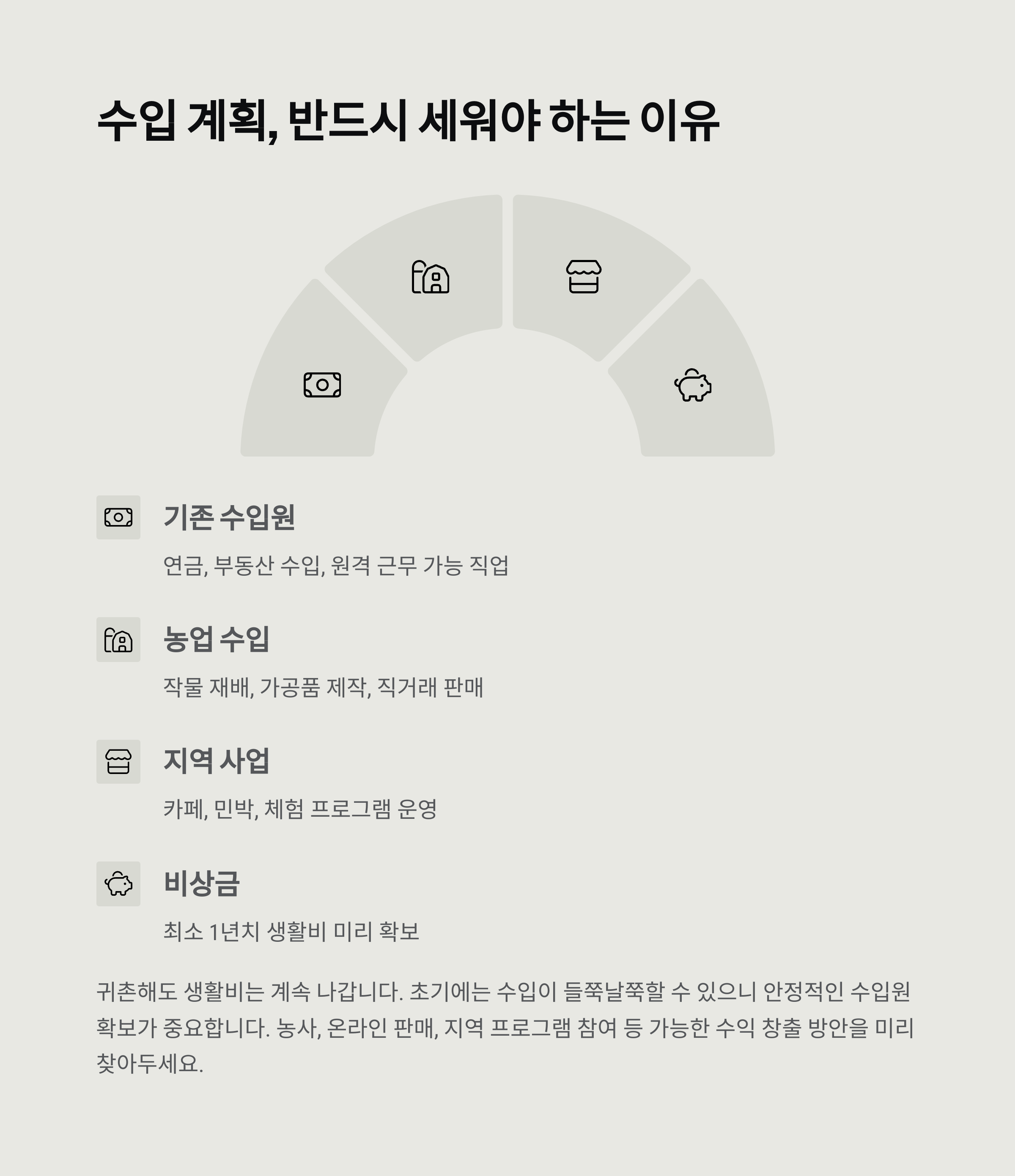 귀촌한다고 해도 생활비는 계속 나갑니다. 연금, 부동산 수입이 있거나 원격 근무가 가능한 직업이 있다면 다행이지만, 그렇지 않은 경우엔 귀촌지에서 새로운 수입원을 반드시 마련해야 합니다. 농사든, 온라인 판매든, 지역 프로그램 참여든 가능한 수익 창출 방안을 찾아야 합니다. 초기에는 수입이 들쭉날쭉할 수 있으니 최소 1년 치 생활비는 미리 확보해두는 것이 안정적인 정착에 도움이 됩니다.