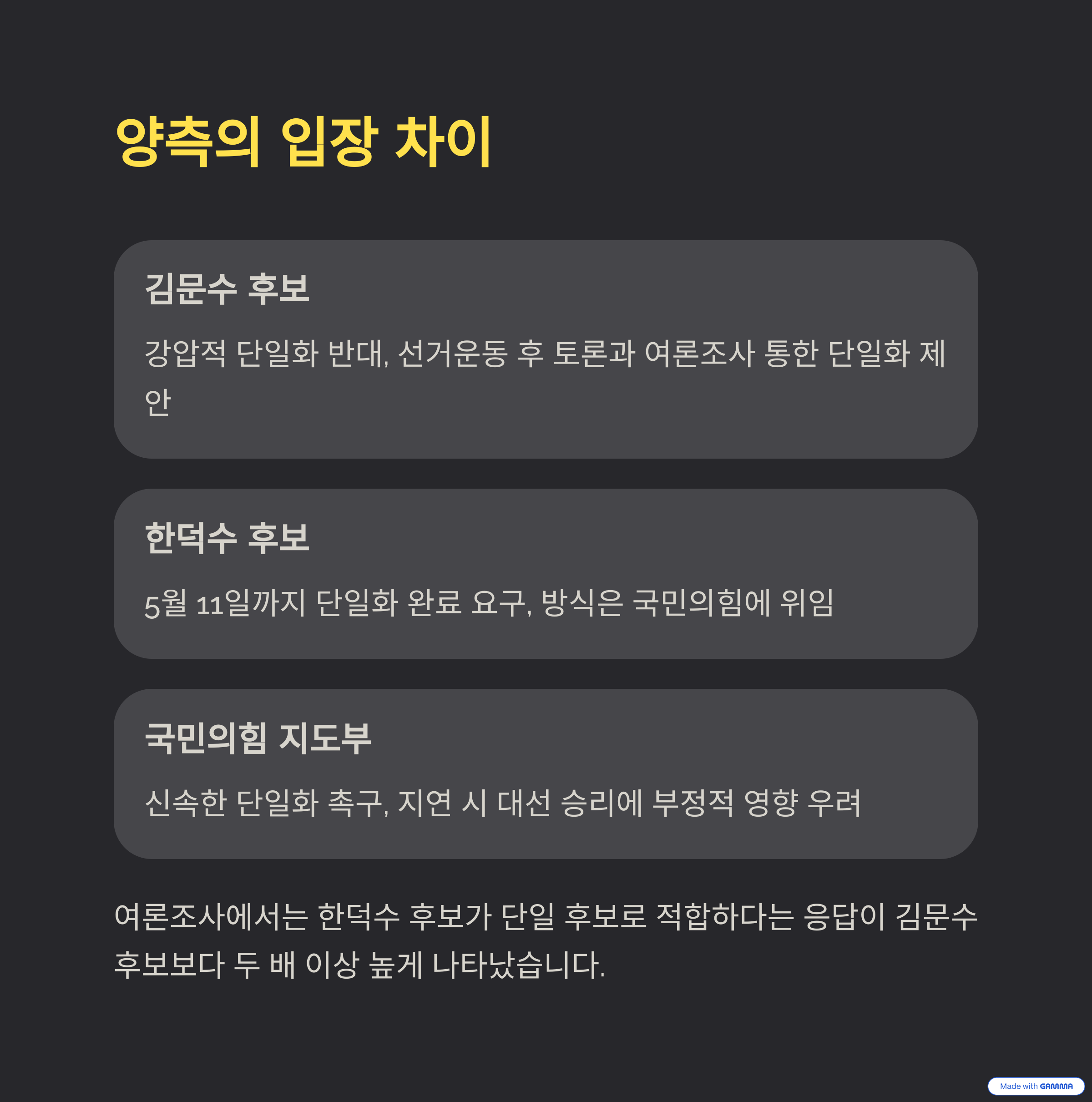 현재까지 양측의 입장 차이가 좁혀지지 않고 있으며, 단일화 시점과 방식에 대한 합의도 이루어지지 않고 있습니다. 김문수 후보가 제안한 단일화 일정은 대선 후보 등록 마감일 이후에 해당되므로, 현실적으로 단일화가 이루어질 가능성은 낮아 보입니다. 이러한 상황은 보수 진영의 분열로 이어질 수 있으며, 대선에서의 경쟁력 약화로 연결될 수 있습니다.