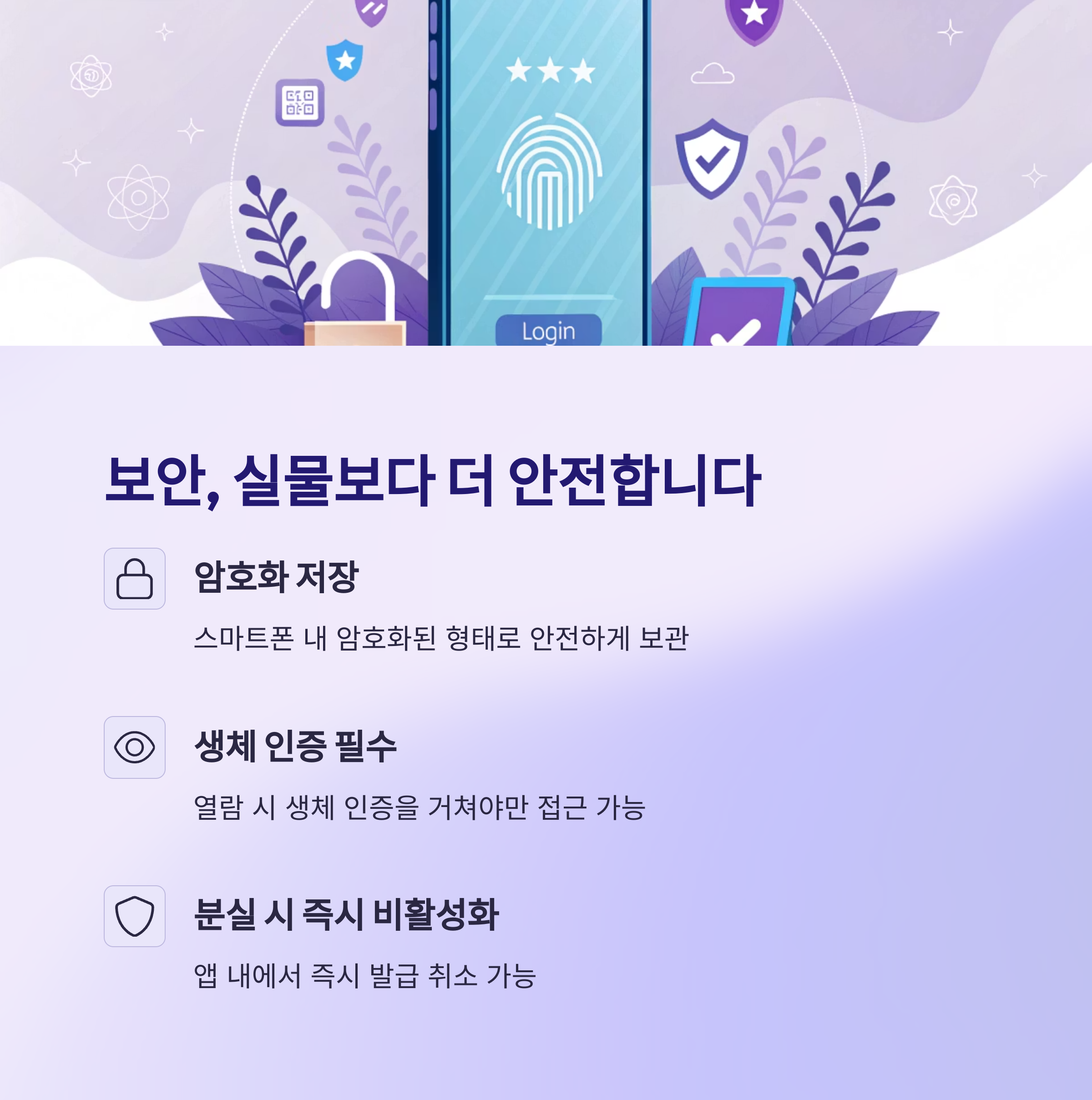 가장 많은 사람들이 걱정하는 부분은 개인정보 유출입니다. 하지만 모바일 신분증은 스마트폰 내에서 암호화된 형태로 저장되며, 생체 인증을 거쳐야만 열람이 가능하도록 설계되어 있어 보안성이 매우 높습니다. 또한 분실이나 도난 시 즉시 앱 내에서 비활성화하거나 발급 취소가 가능하므로 실물 신분증 분실보다 더 안전하다고 볼 수 있습니다.