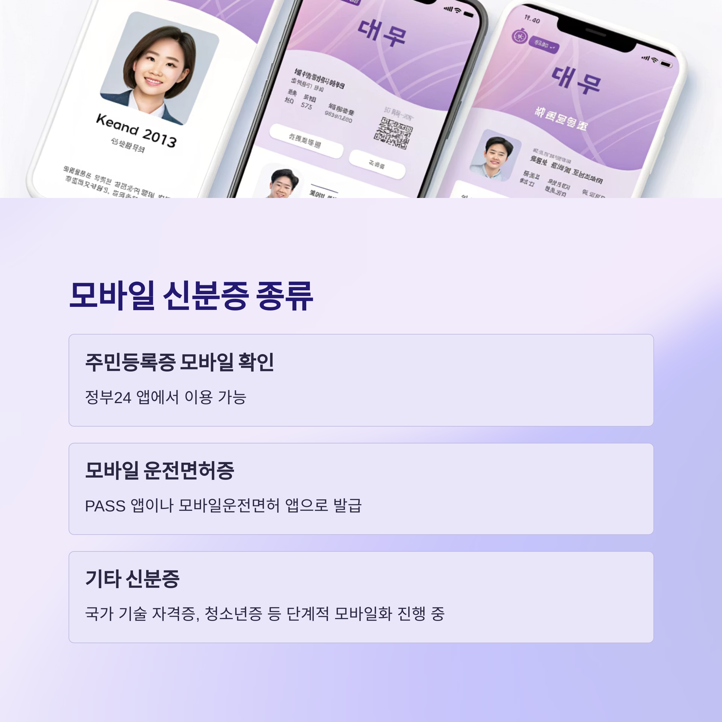 현재 대한민국에서 제공되는 대표적인 모바일 신분증은 주민등록증 모바일 확인 서비스와 모바일 운전면허증이 있습니다. 주민등록증 모바일 확인 서비스는 정부24 앱에서 이용 가능하며, 모바일 운전면허증은 PASS 앱이나 모바일운전면허 앱을 통해 발급받을 수 있습니다. 또한 국가 기술 자격증, 청소년증 등도 단계적으로 모바일화되고 있는 중입니다.