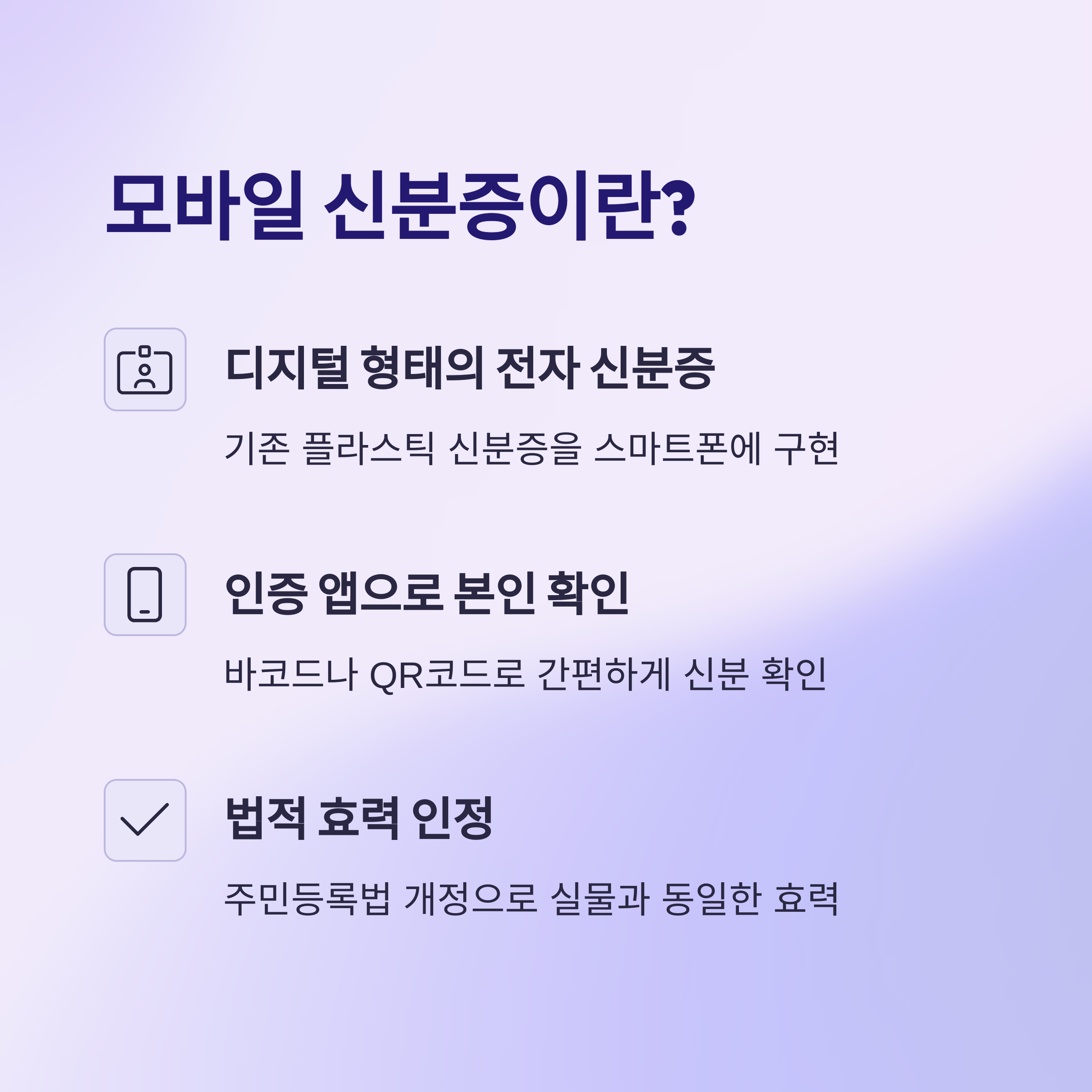 모바일 신분증은 기존의 플라스틱 신분증을 디지털 형태로 구현한 전자 신분증입니다. 스마트폰에 설치된 인증 앱을 통해 본인 확인을 할 수 있도록 만들어졌습니다. 정부24, 모바일 운전면허 앱, 패스 앱 등 여러 인증 수단을 통해 발급받을 수 있으며, 스마트폰 화면에서 바코드 또는 QR코드를 제시해 신분 확인이 가능합니다.