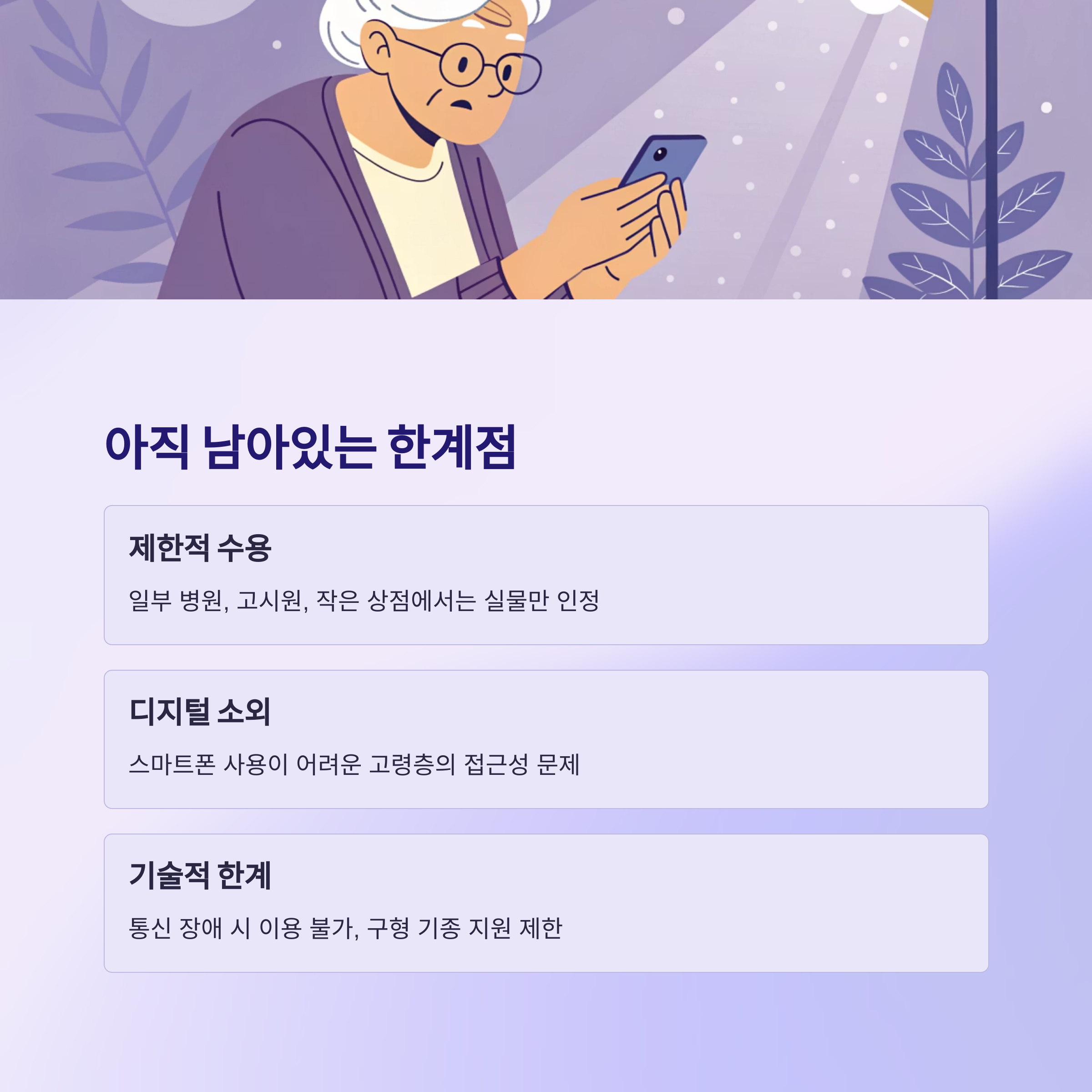 아직 모든 기관과 업장에서 모바일 신분증을 받아들이고 있지는 않습니다. 특히 일부 병원, 고시원, 작은 상점 등에서는 실물 신분증만 요구하는 경우도 존재합니다. 또한 스마트폰을 사용할 수 없는 고령층이나, 통신 장애 시 이용이 불가능하다는 한계도 있습니다. 이러한 점들에 대해서는 앞으로 점차 개선되어야 할 과제로 남아 있습니다.
