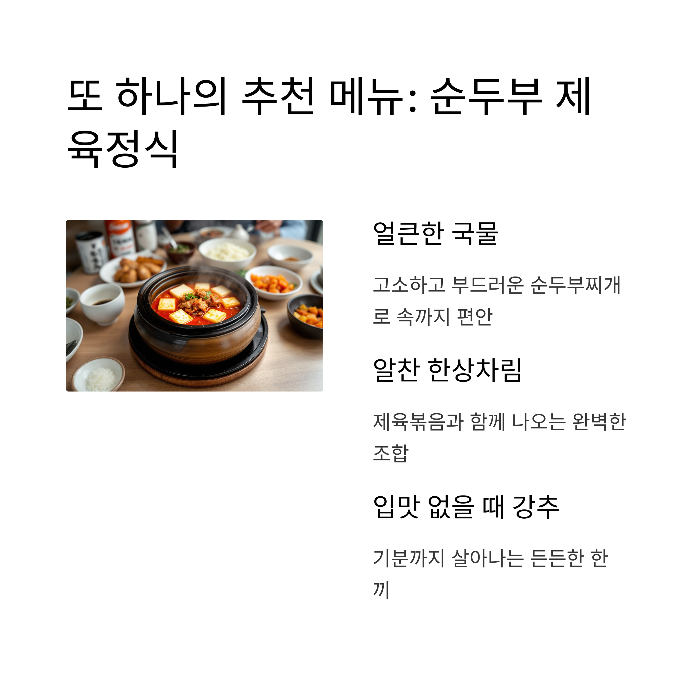 다음 방문 때는 순두부 제육정식을 시켜봤는데요. 얼큰한 순두부찌개에 제육볶음이 함께 나오는 구성이라 완전 알찬 한상차림 느낌이에요. 국물 좋아하는 분들에게 강추하고 싶어요. 순두부가 고소하고 부드러워서 속도 편안하고, 제육이랑의 조합도 찰떡이에요. 입맛 없을 때도 이거 하나면 기분 확 살아날 것 같은 느낌이랄까요.