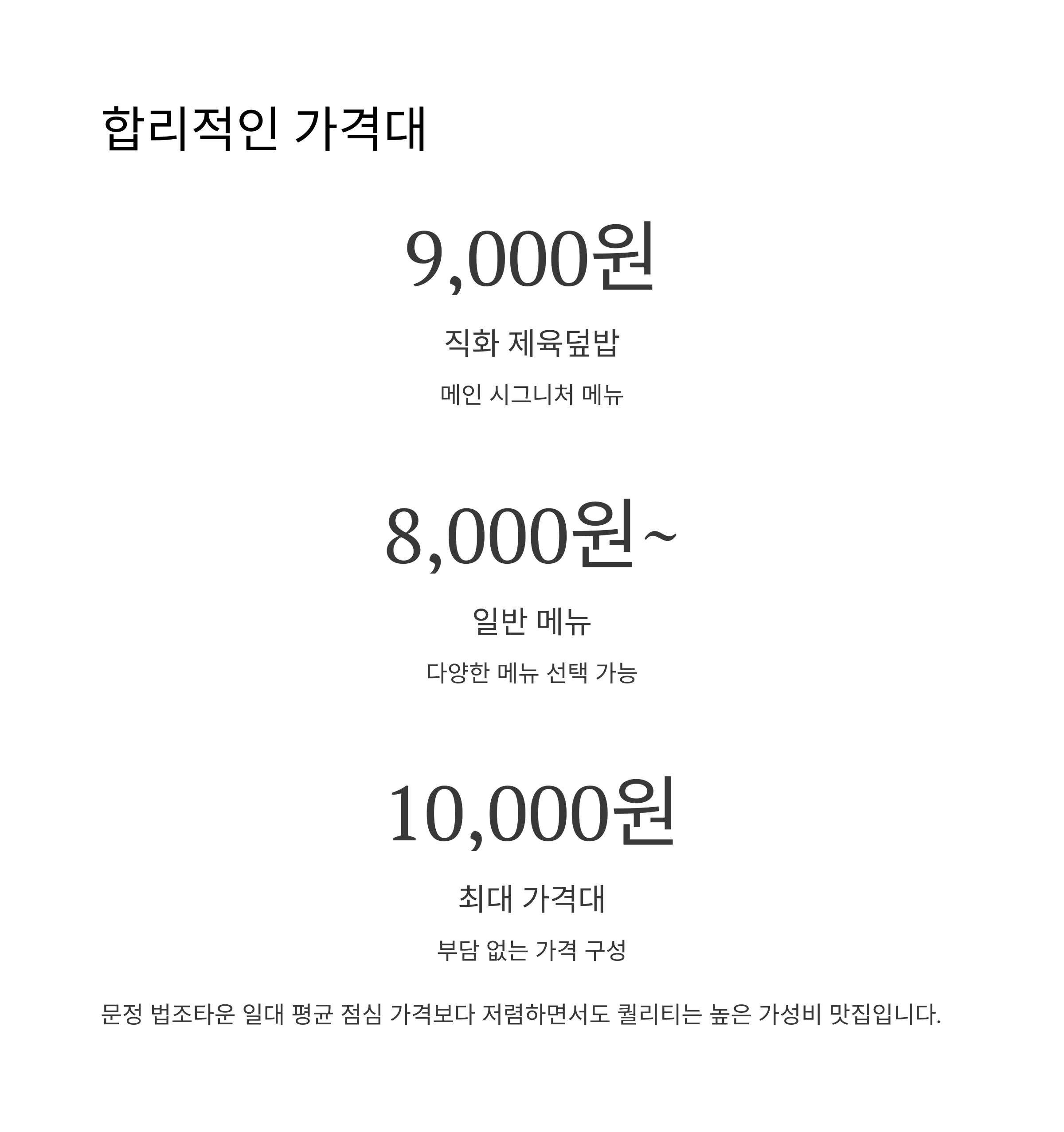요즘 문정 법조타운 일대 점심 물가 만만치 않잖아요. 프랜차이즈 덮밥 하나 먹어도 11,000원 훌쩍 넘는 경우 많은데, 미도인은 직화 제육덮밥 기준 9,000원이었어요. 밑반찬, 쌈채소까지 나오는데 이 가격이면 솔직히 괜찮다 싶었죠. 다른 메뉴도 대부분 8,000원~10,000원 선이라 부담 없이 자주 갈 수 있는 곳이더라고요.