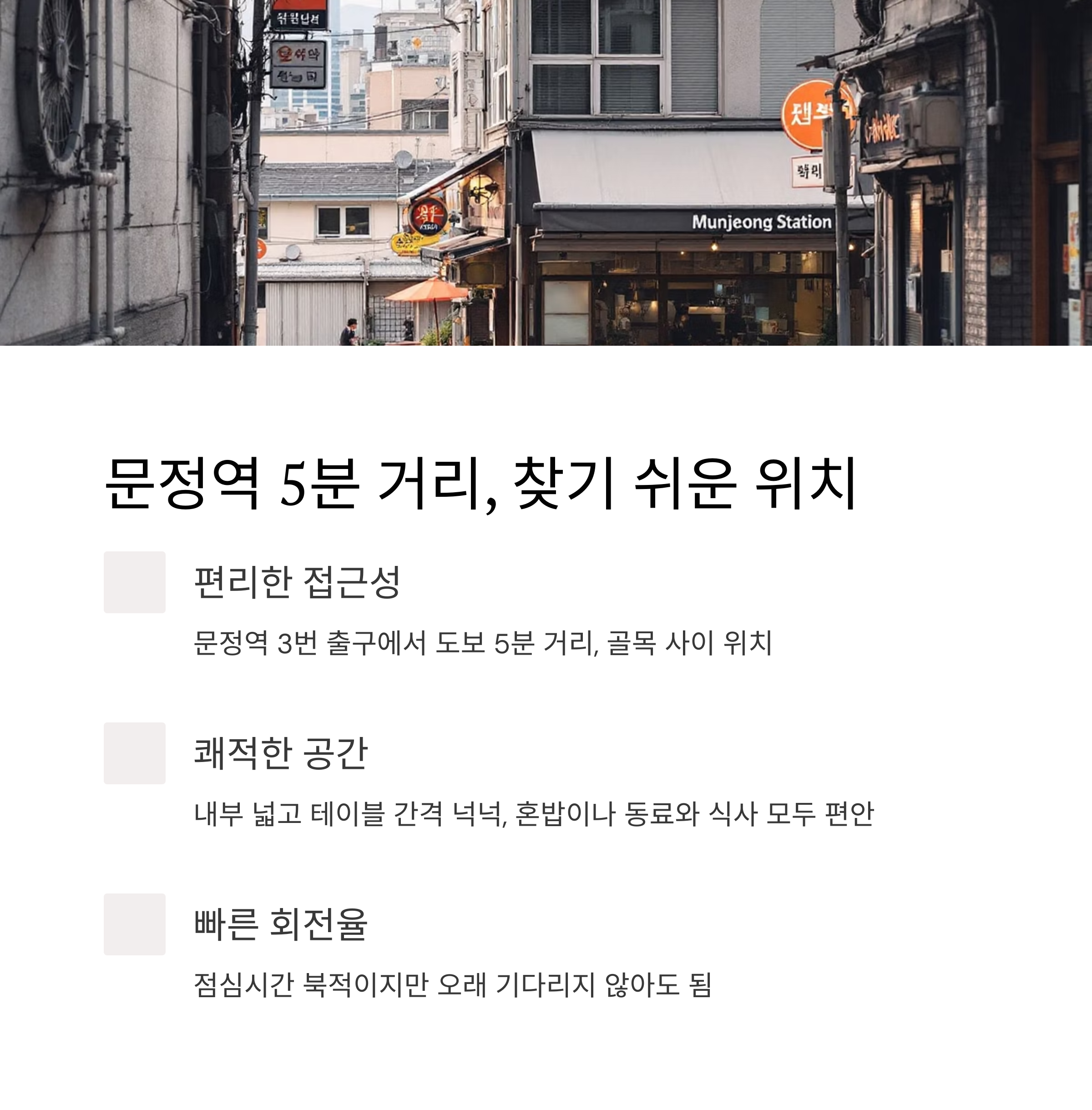 ‘미도인’은 문정역 3번 출구에서 나와 쭉 걸어오면 골목 사이에 조용히 자리 잡고 있어요. 번화한 거리에서 살짝 벗어난 위치라 더 조용하고, 주변 직장인들이 자주 찾는 이유가 딱 이해되더라고요. 점심시간엔 사람들로 북적이지만, 회전율도 꽤 빨라서 오래 기다리진 않았어요. 내부는 생각보다 넓고, 테이블 간격도 넉넉해서 혼밥이든 동료와의 점심이든 편하게 먹을 수 있는 분위기였어요.