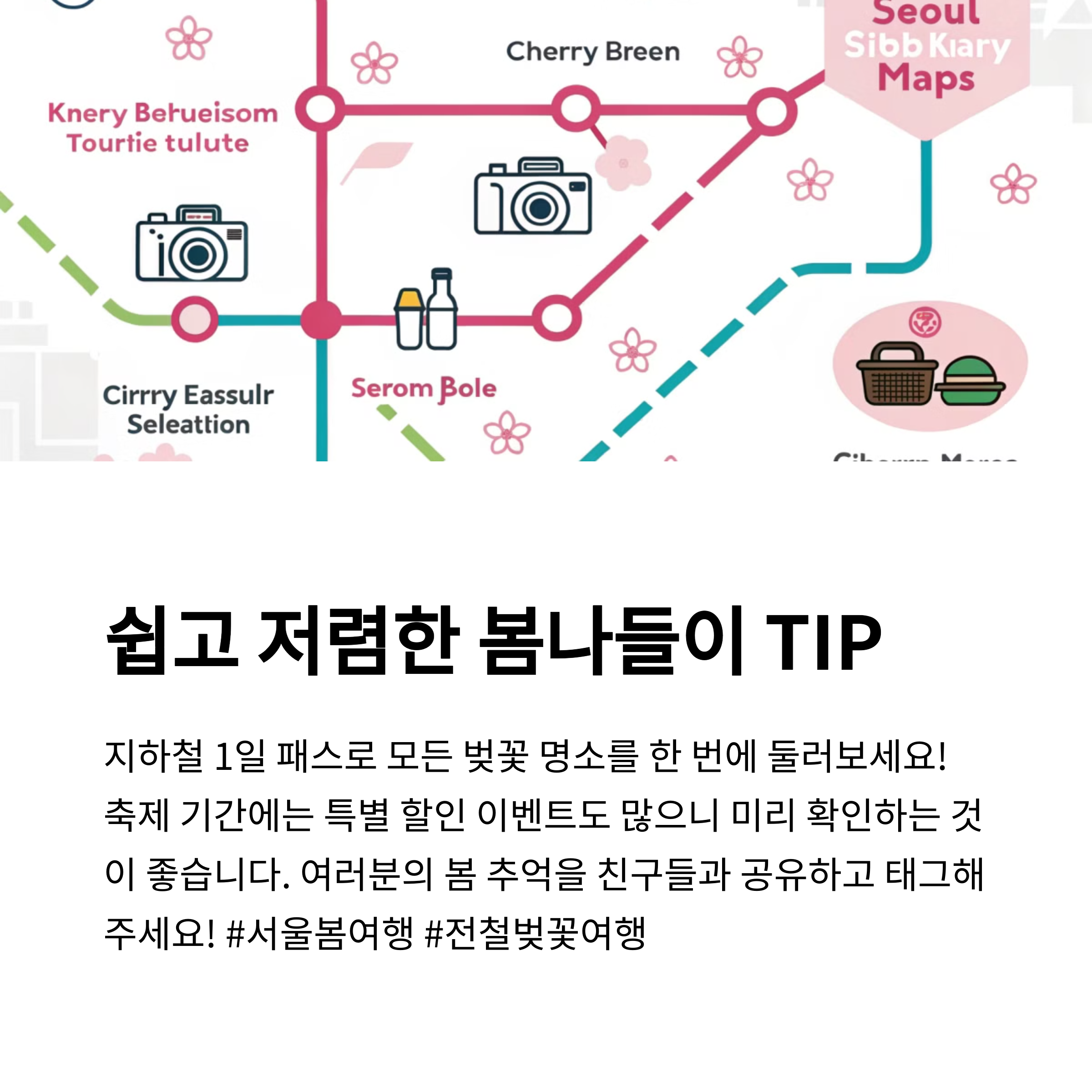 봄은 누구에게나 설렘을 안겨주는 계절입니다. 가까운 서울 안에서도 전철만 타면 충분히 여행 기분을 낼 수 있고, 아름다운 자연과 다채로운 지역 문화를 함께 경험할 수 있는 특별한 시간이 마련됩니다. 이 글에서 소개한 전철 기반 봄 축제 코스는 교통이 편리하고 볼거리와 즐길 거리가 풍부해 혼자 또는 함께하는 모든 분들께 유익한 시간이 될 것입니다. 계절의 변화를 가장 잘 느낄 수 있는 이 시기, 이번 주말은 특별한 준비 없이 떠나는 봄 여행으로 일상의 리듬을 잠시 쉬어가보는 건 어떨까요? 서울의 봄이 여러분의 기억 속에 오래 남는 추억이 되길 바랍니다.