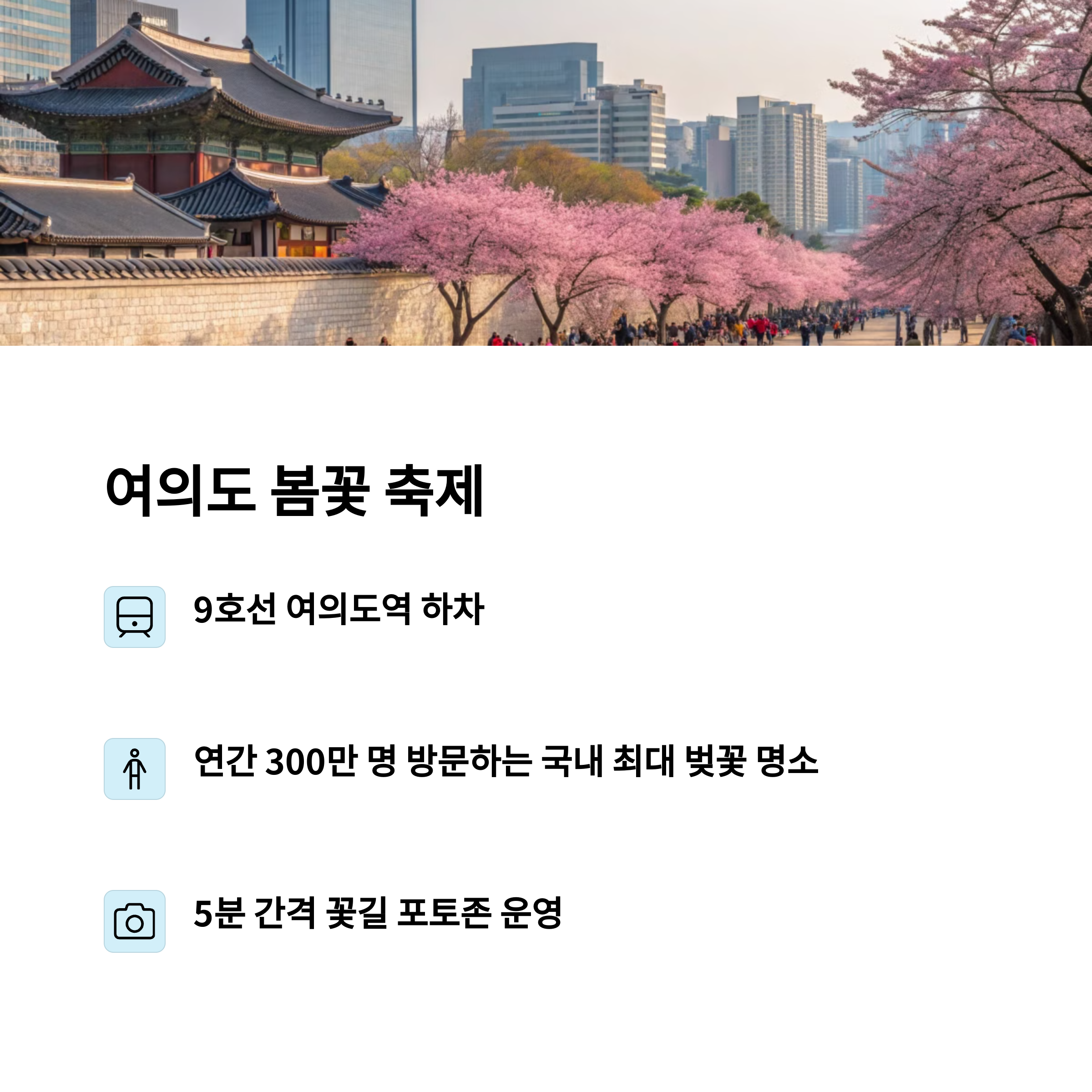 | 여의도, 석촌호수, 응봉산 등 인기 명소 정리 | 노선별로 갈 수 있는 코스 정리 | 2025년 주요 행사 일정 안내 |