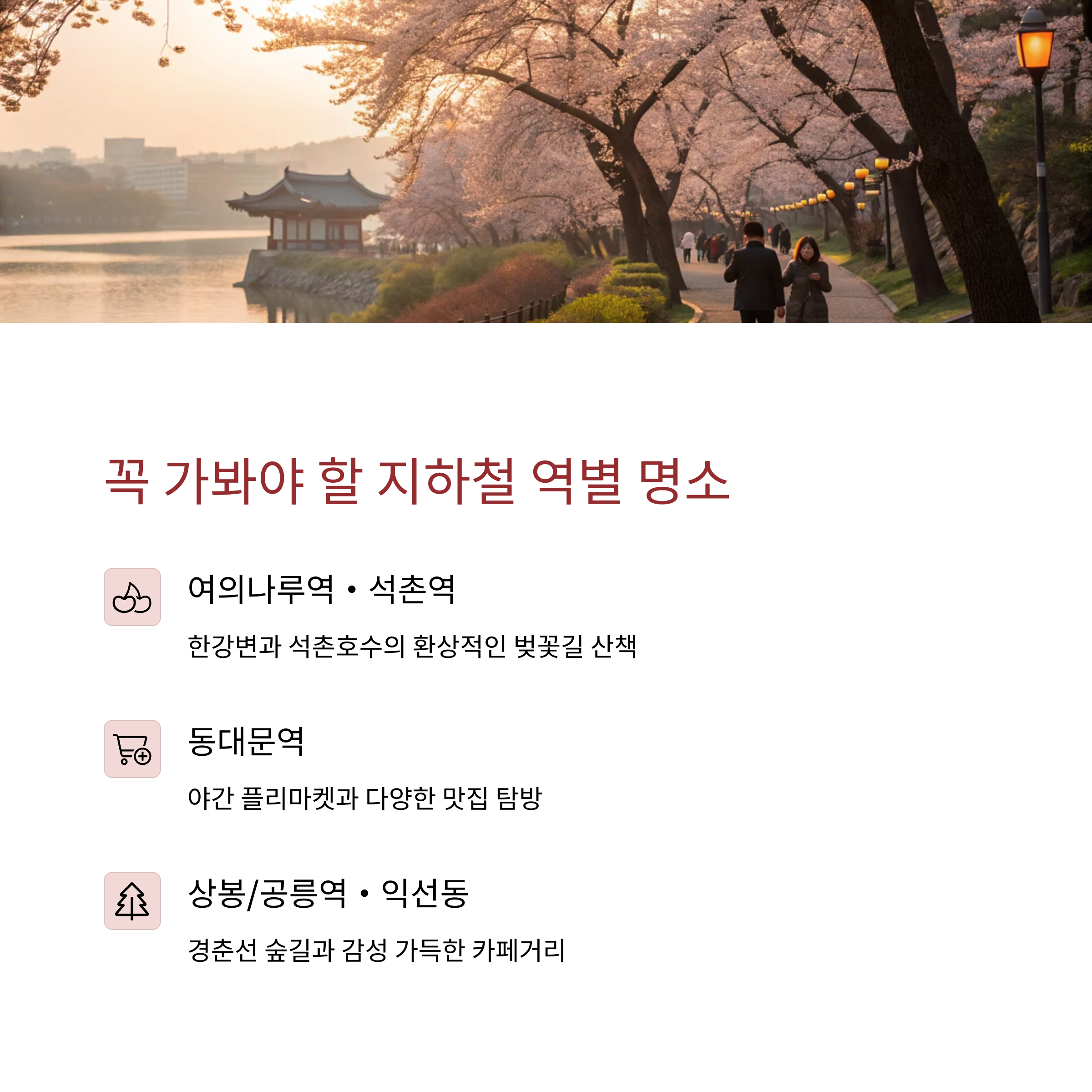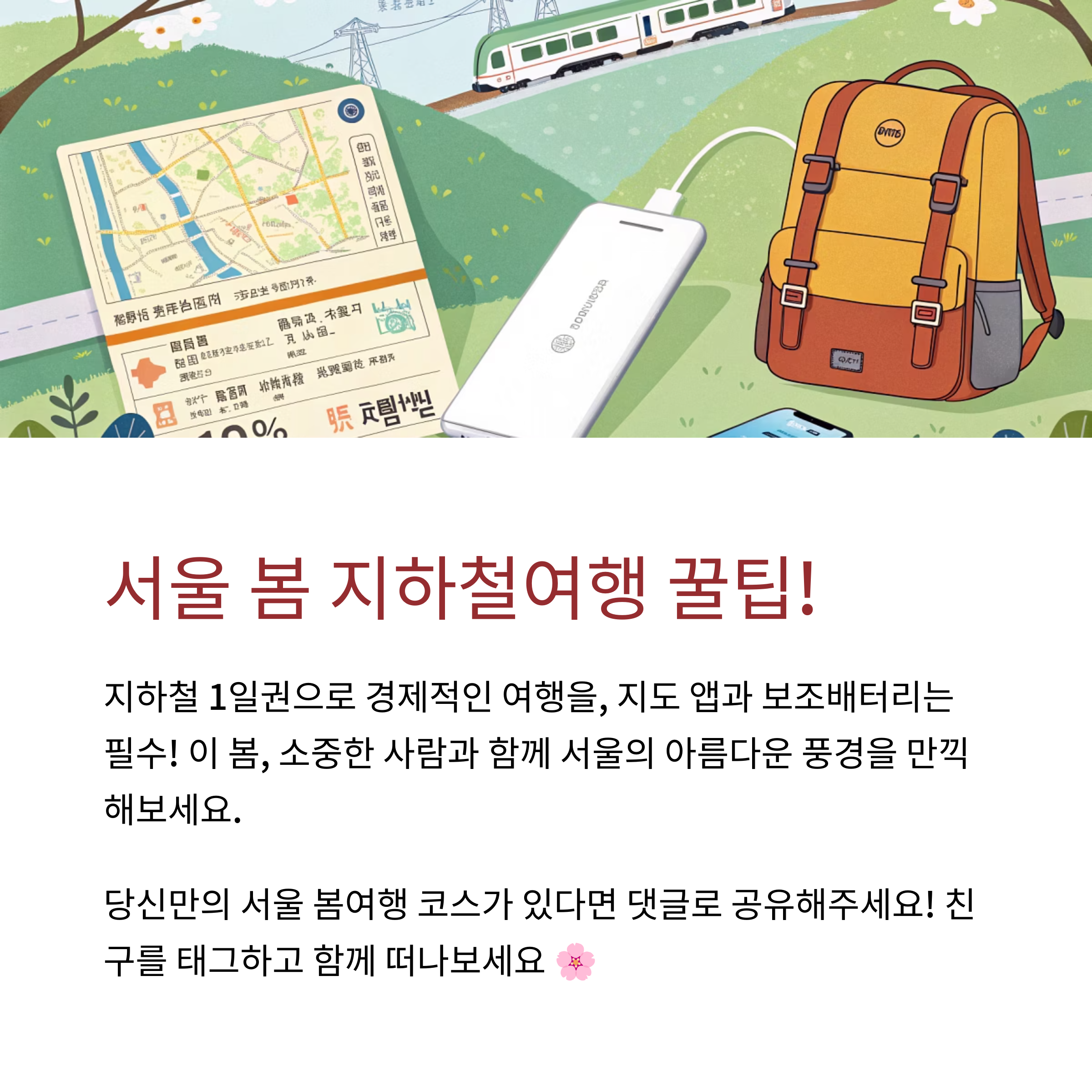 오늘 소개해드린 ‘전철 따라 떠나는 봄날의 서울 축제 여행’ 코스, 어떠셨나요? 지하철만 타고도 이렇게 다채롭고 낭만 가득한 하루를 보낼 수 있다니, 저도 다시 한번 놀랐답니다. 이번 봄에는 가까운 곳에서 특별한 추억을 만들어보세요. 혼자여도 좋고, 누군가와 함께라면 더 좋겠죠. 댓글로 여러분만의 봄 추천 장소도 공유해주세요! 😊