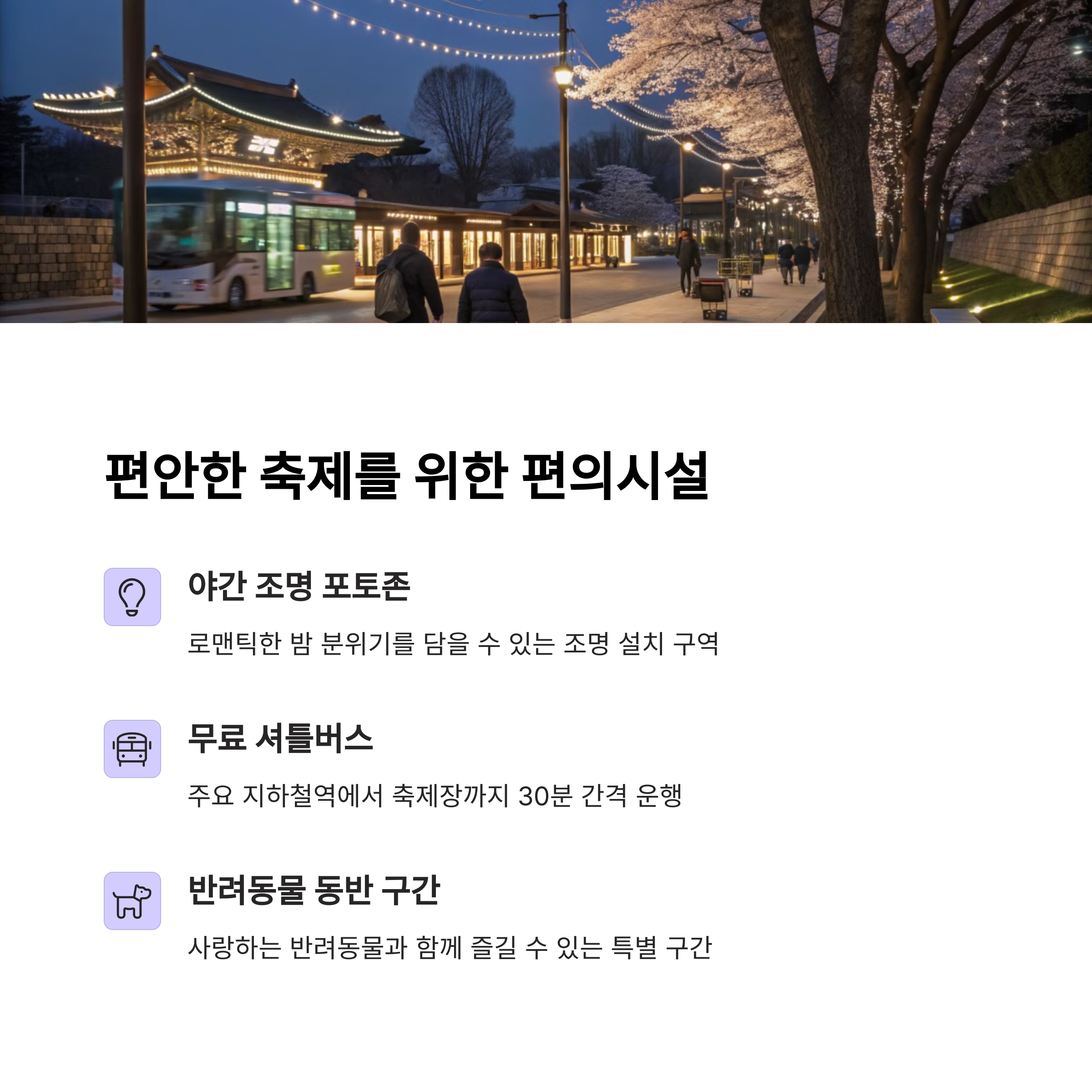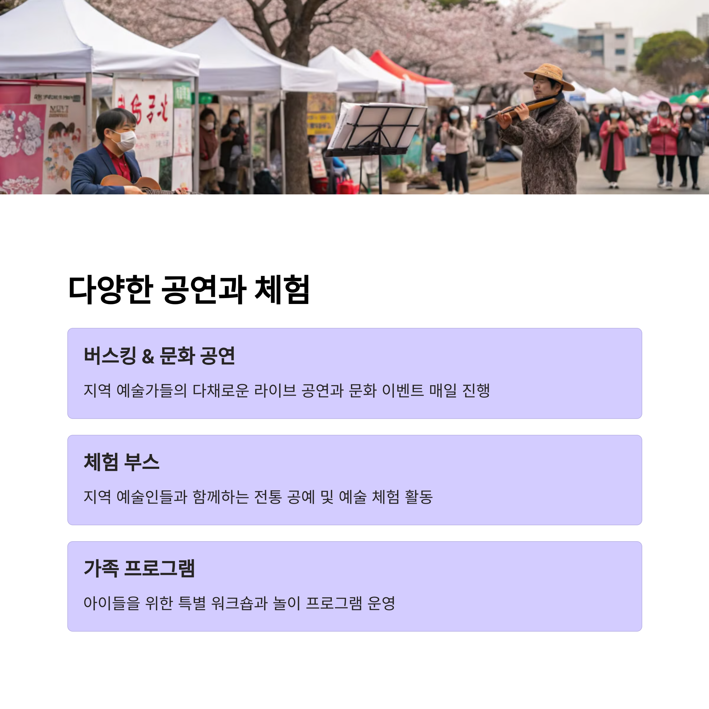 축제 기간 동안에는 매일 저녁, 감성적인 라이브 공연과 야간조명 아래 펼쳐지는 벚꽃길이 방문객들에게 깊은 인상을 남깁니다. 특히 인생샷을 남기기 좋은 포토존, 불꽃놀이 이벤트, 시민이 직접 참여하는 버스킹 무대 등은 축제를 더욱 풍성하게 만들어주는 핵심 요소입니다. 또한 푸드트럭 존에는 지역 특산물과 함께 다양한 길거리 음식이 준비되어 있어 입과 눈이 즐거운 시간을 보낼 수 있습니다. 환경을 고려한 친환경 프로그램도 확대 운영되며, 안전한 축제 운영을 위해 질서 유지 요원과 응급의료 인력도 현장에 배치될 예정입니다.