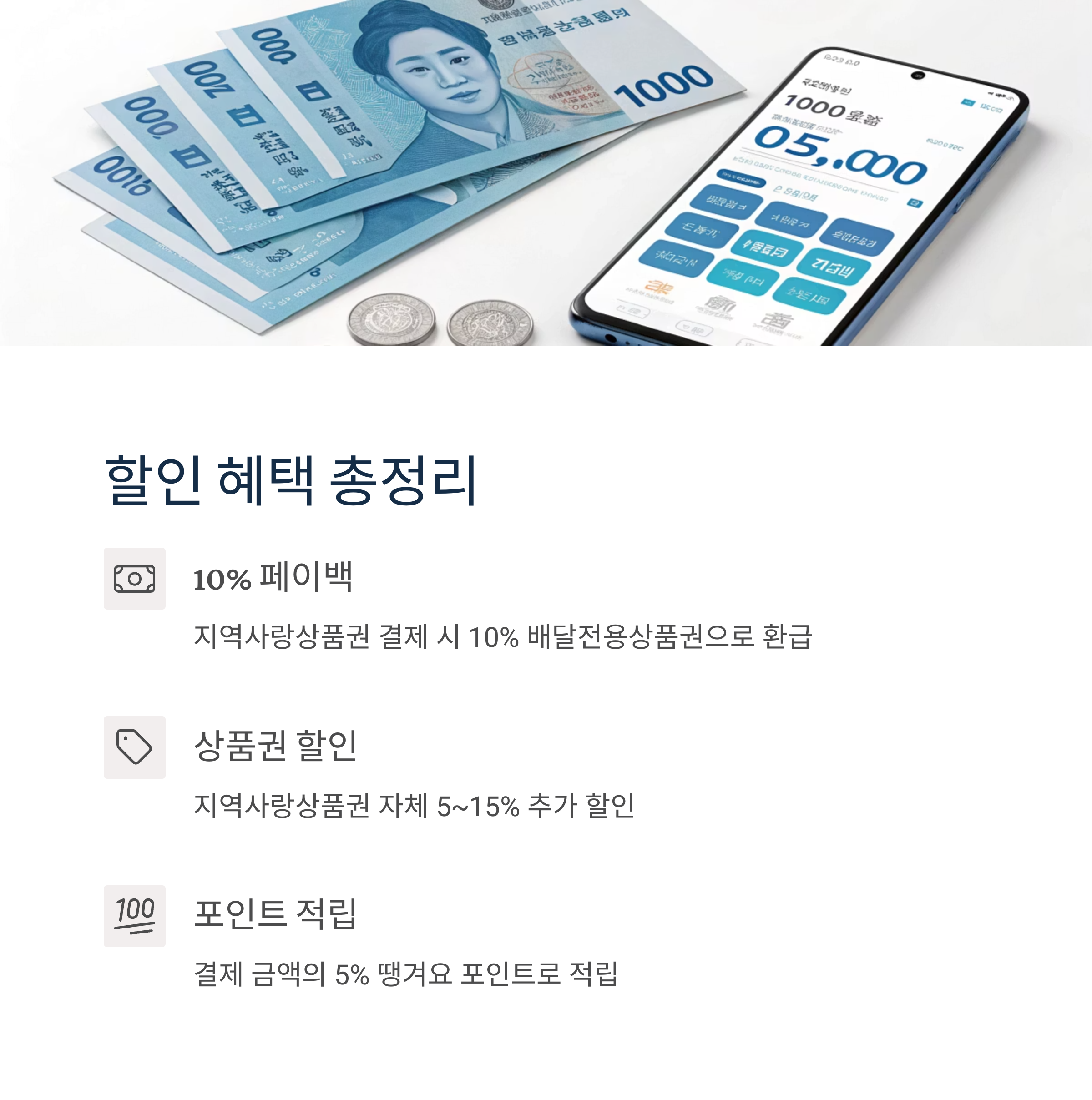- 상품권 할인 발행 혜택: 지역사랑상품권 자체의 할인 발행 혜택으로 5~15%의 추가 할인을 받을 수 있습니다.