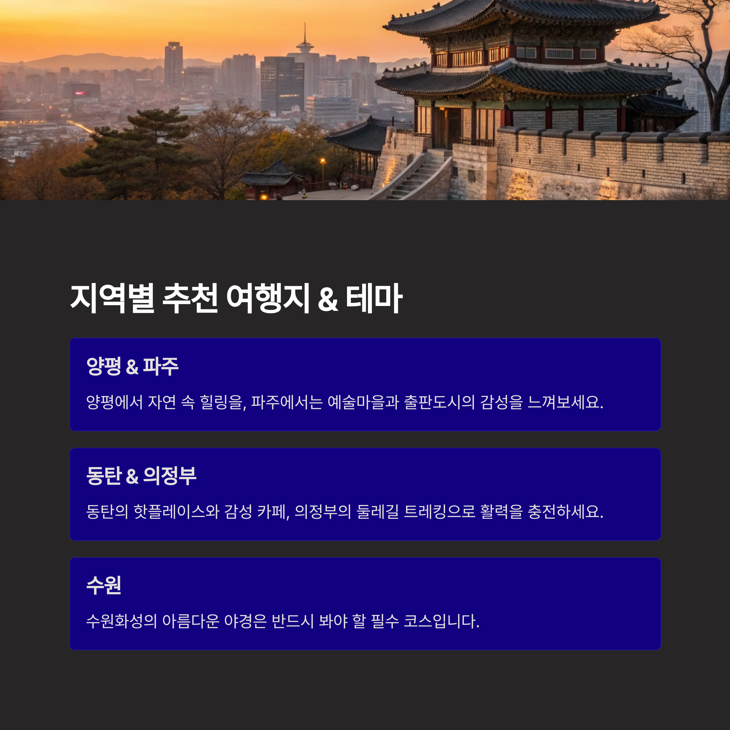 수원은 전통과 현대가 공존하는 도시예요. 특히 수원 화성의 야경은 진짜 놓치면 아쉬운 풍경입니다. 밤이 되면 성벽에 조명이 켜지는데, 그 아래 산책하는 기분이 정말 낭만적이에요. 아래에 수원 여행 추천 코스를 정리해봤어요.