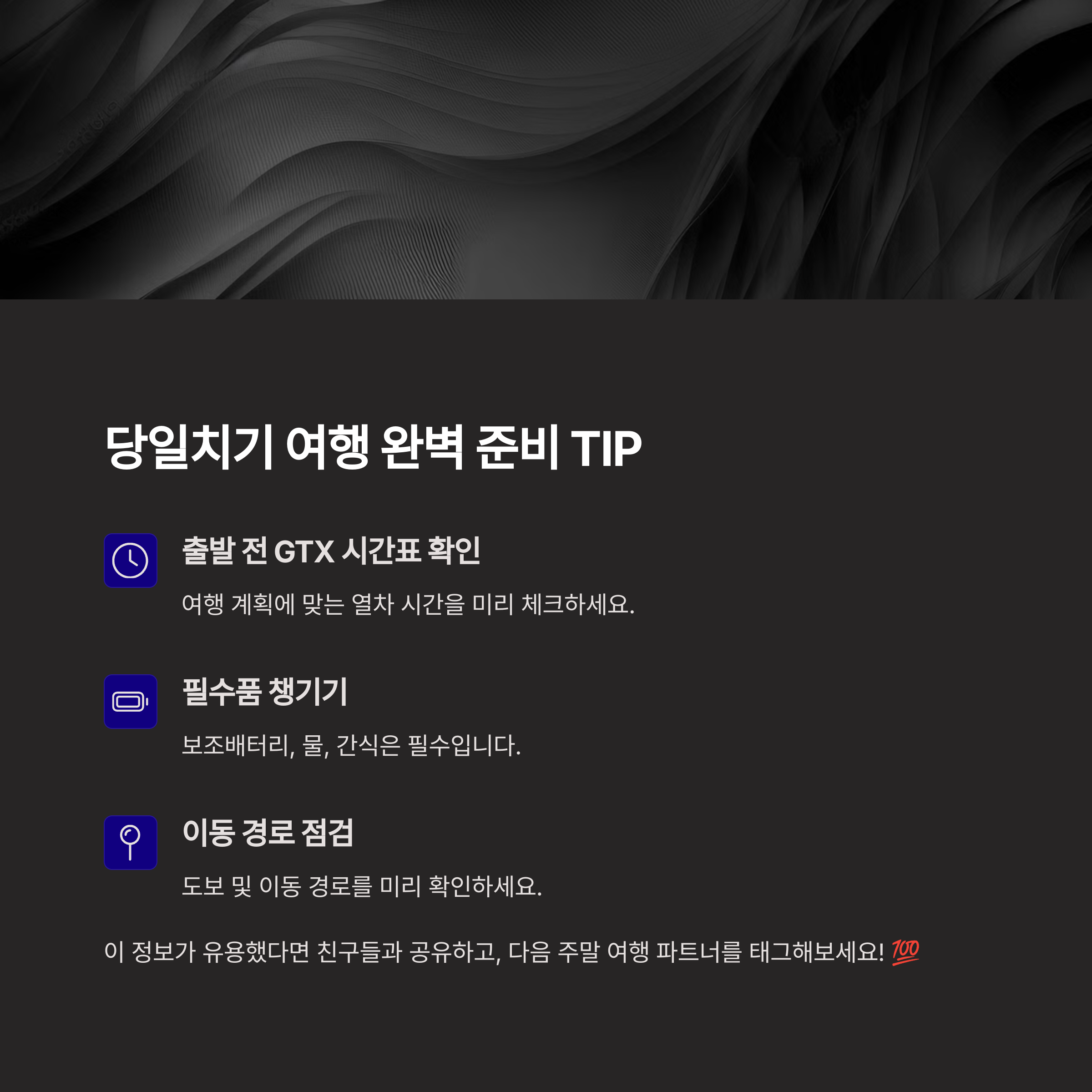 자, 이렇게 수도권에서 GTX를 타고 훌쩍 떠날 수 있는 힐링 여행지들을 살펴봤는데요, 마음에 드는 곳 있으셨나요? 저처럼 갑자기 떠나고 싶을 때, 또는 친구들과 소소한 추억 만들고 싶을 때 오늘 소개한 장소들이 정말 큰 도움이 될 거예요. 가깝지만 특별한 여행, 일상 속 작은 쉼표가 되어줄 그런 시간. 여러분도 이번 주말, 가벼운 마음으로 한번 떠나보세요. 다녀오시면 어떤 곳이 가장 좋았는지도 꼭 공유해주세요. 우리, 여행 얘기 나누는 거 너무 좋잖아요 😊