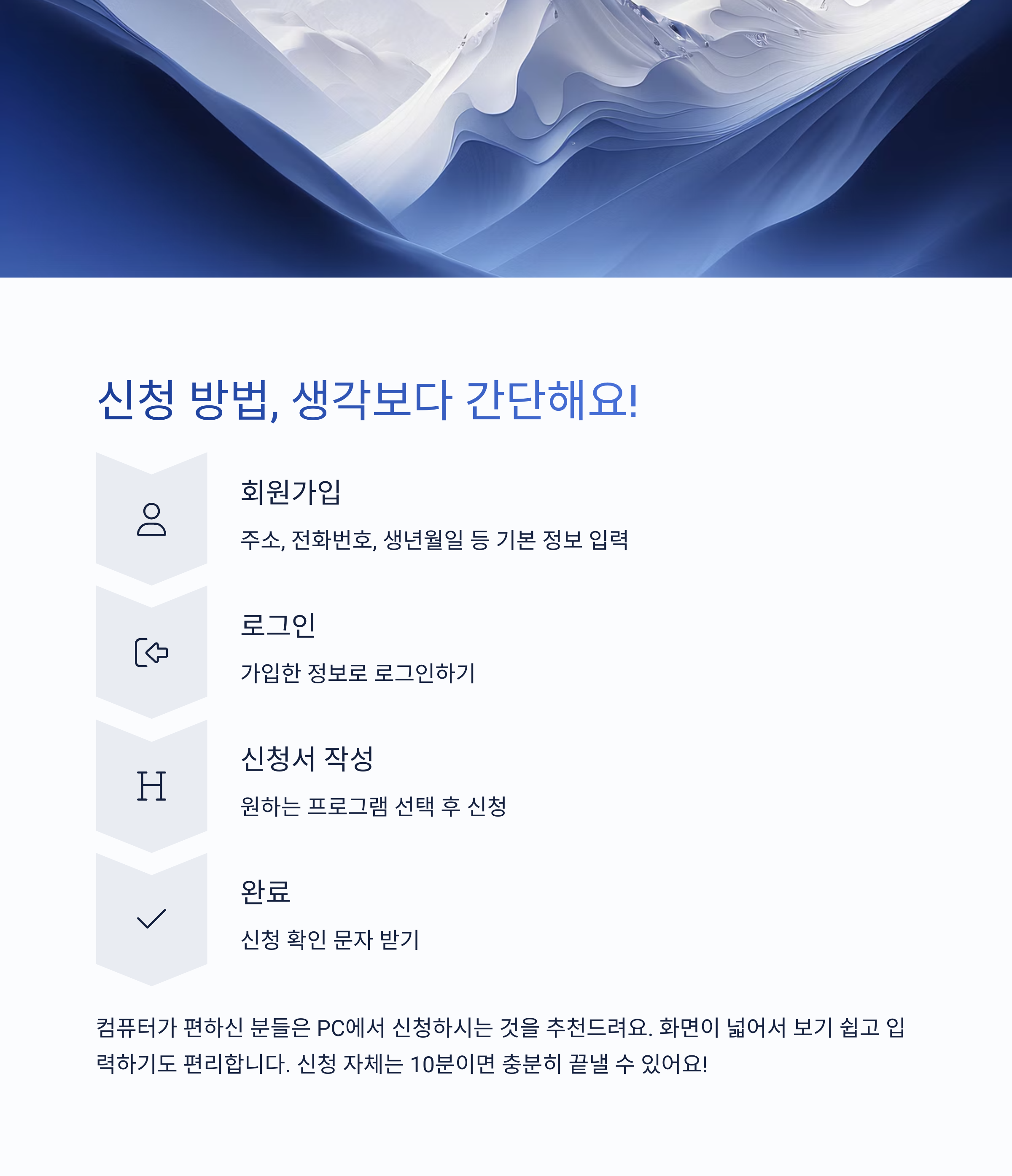 사실 대부분의 신청 절차는 '회원가입 → 로그인 → 신청서 작성 → 완료' 순서로 되어 있어요. 이 중에서 제일 헷갈려하는 부분이 회원가입입니다. 주소, 전화번호, 생년월일, 인증번호 등 입력할 게 많아서 그렇지, 차근차근 하나씩 따라가면 다 할 수 있어요. 만약 스마트폰보다 컴퓨터가 편하신 분들이라면 PC에서 하시는 걸 추천드립니다. 화면이 넓어서 보기 쉬워요.