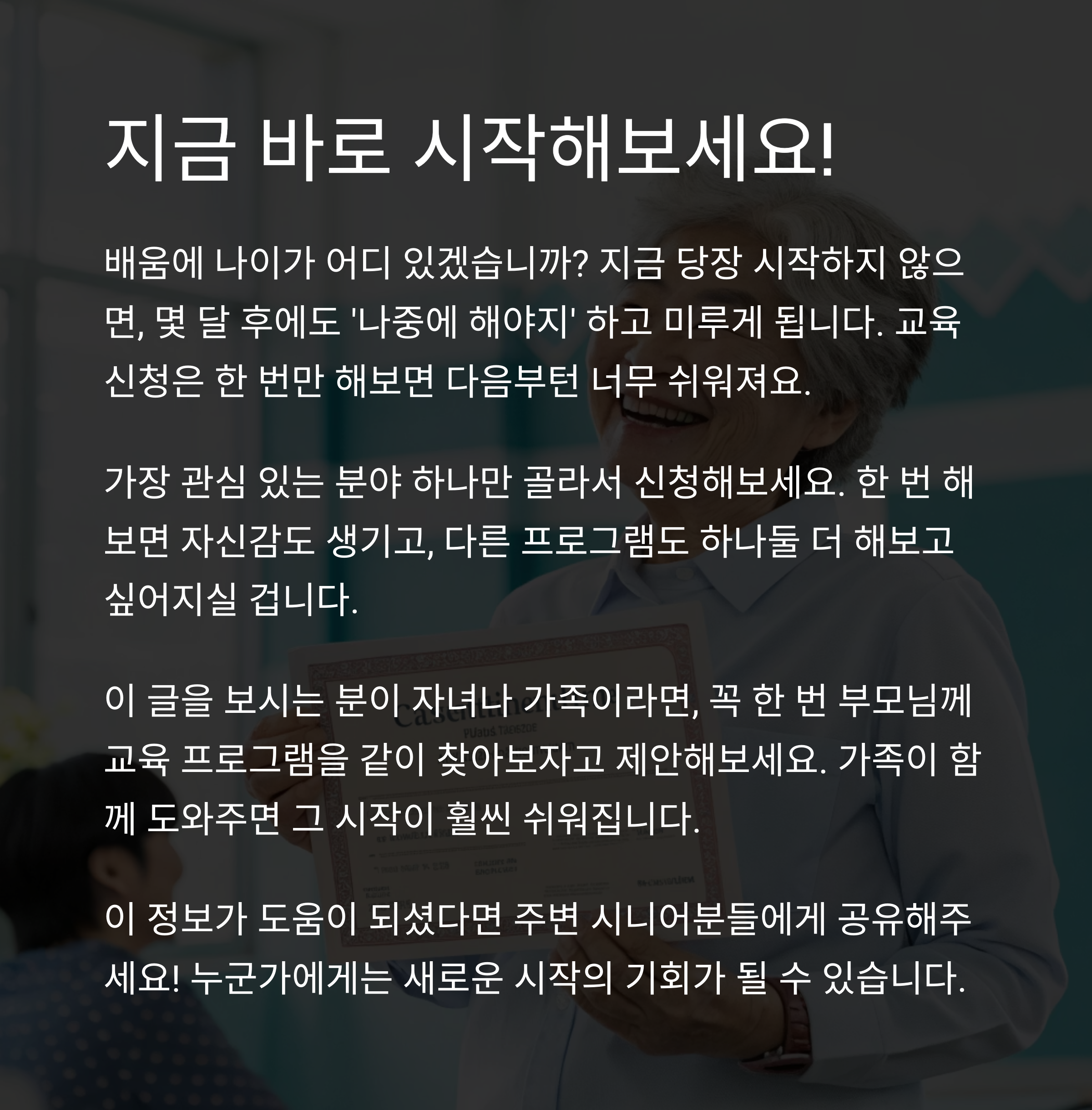 혹시 이 글을 보고 계신 분이 자녀나 가족이라면, 꼭 한 번 부모님께 교육 프로그램을 같이 찾아보자고 제안해보세요. 가족이 함께 도와주면 그 시작이 훨씬 쉬워지고, 무엇보다 부모님도 정말 좋아하시거든요. 아니면 지인이나 친구분께도 ‘이런 수업 있대’ 하면서 알려주는 것도 좋아요. 지금 나눠주신 정보가 누군가에겐 큰 기회가 될 수도 있답니다.