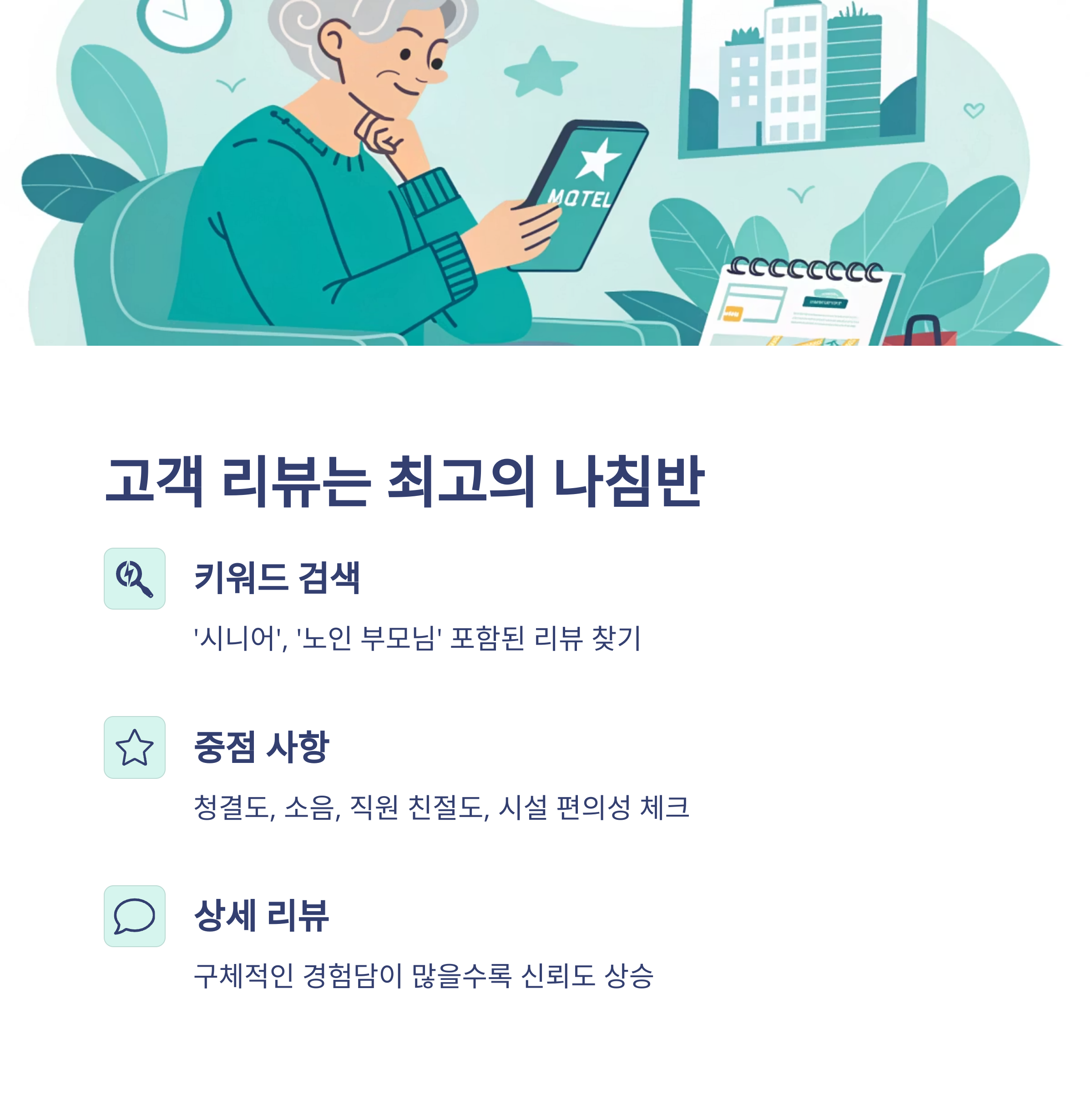 실제 이용자들의 경험담은 그 어떤 광고보다 신뢰가 큼다. 특히 ‘시니어’, ‘노인 부모님 모시고 간 여행’ 같은 키워드가 리뷰에 들어있는 숙소는 더 참고할만 하쥬. 숙소의 청결, 소음, 직원 친절도, 시설 이용 편의성 등을 상세히 언급한 리뷰가 많을수록 믿고 선택할 수 있슴다.