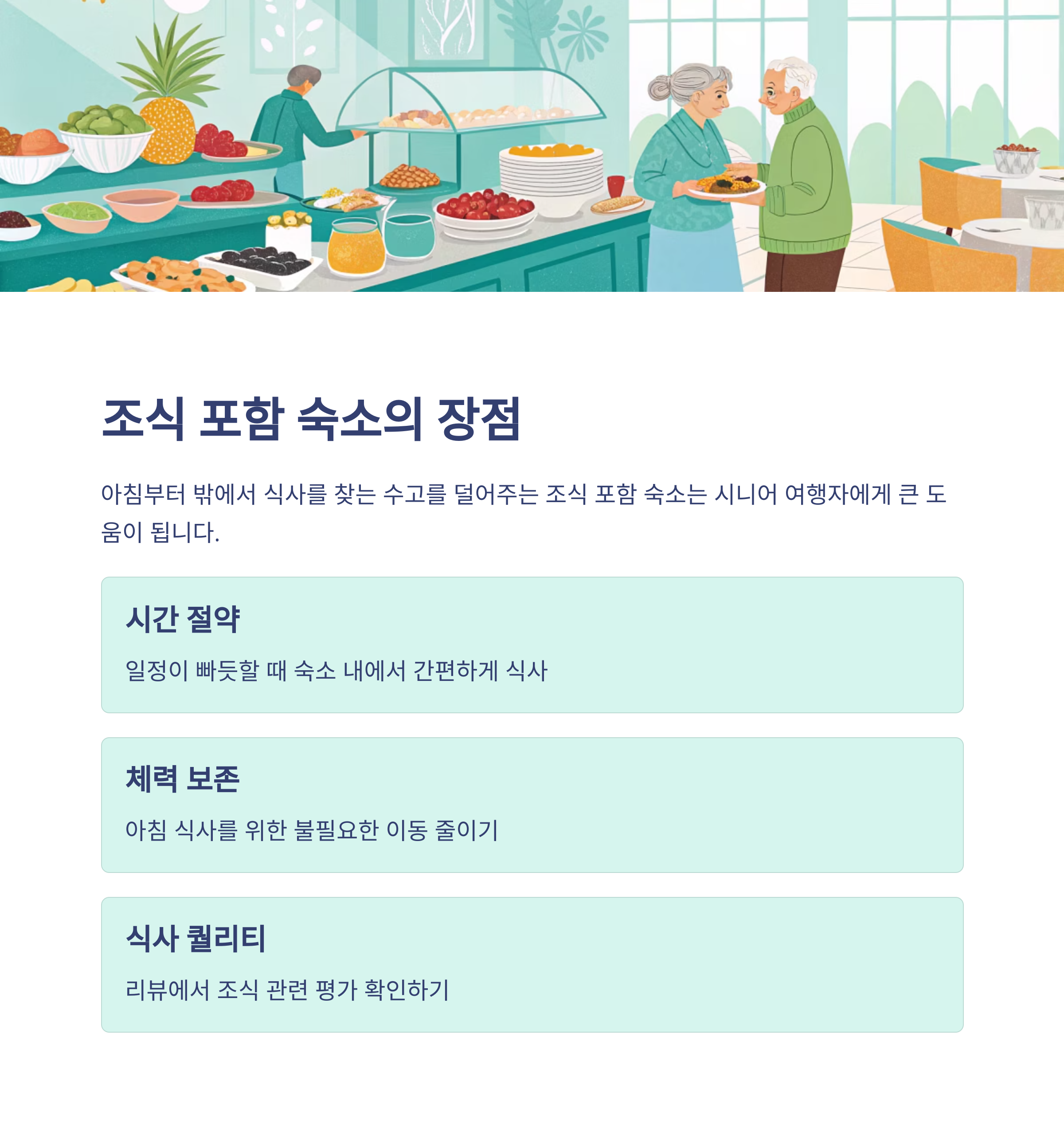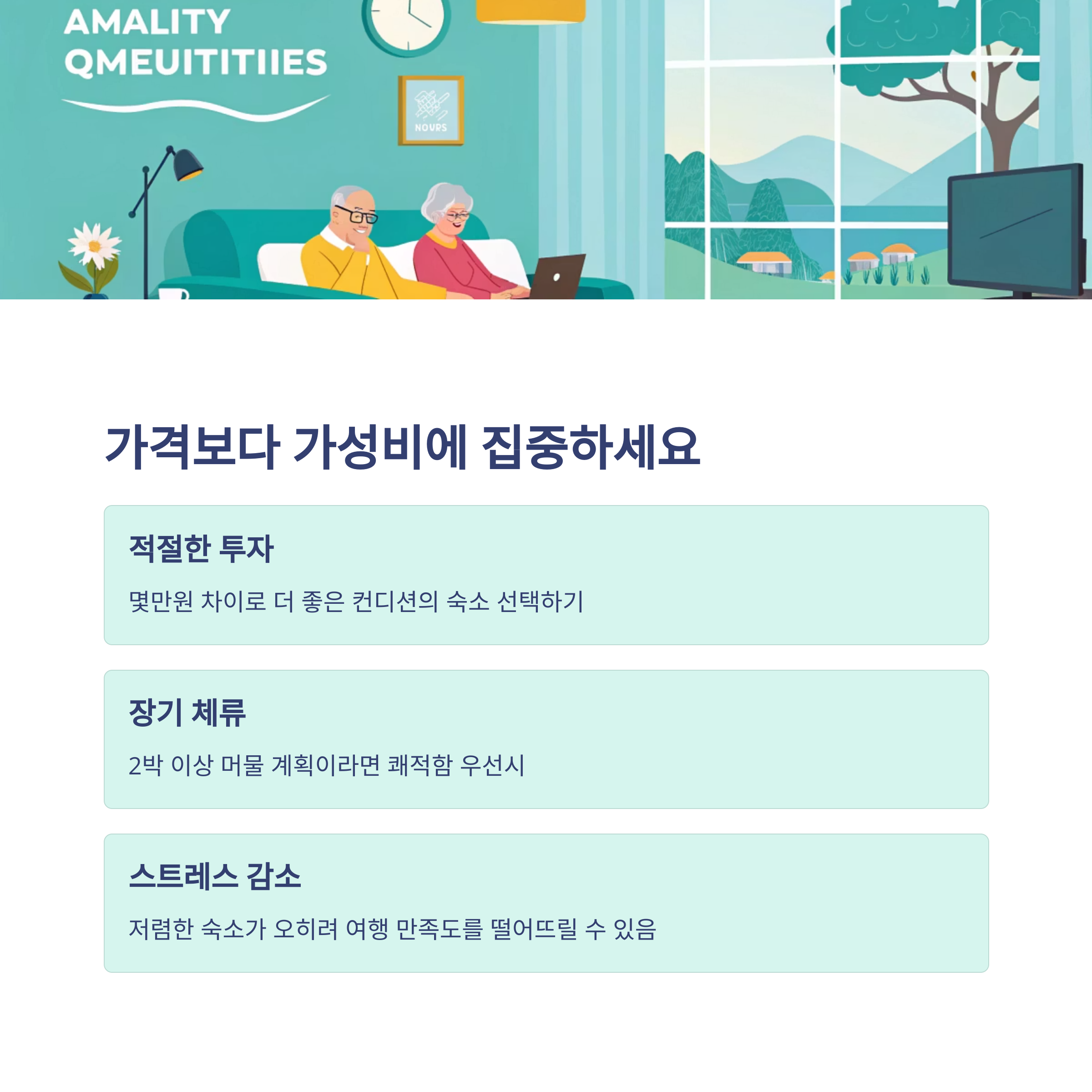물론 숙박비는 무시할 수 없는 요소지만, 시니어 여행에서 너무 저렴한 숙소는 오히려 스트레스를 유발할 수 있어요. 몇 만원 차이로 더 좋은 컨디션의 숙소를 잡을 수 있다면 과감히 투자하는 게 여행 만족도에 훨씬 유리하쥬. 특히 2박 이상 머물 계획이라면 숙소의 쾌적함은 필수!
