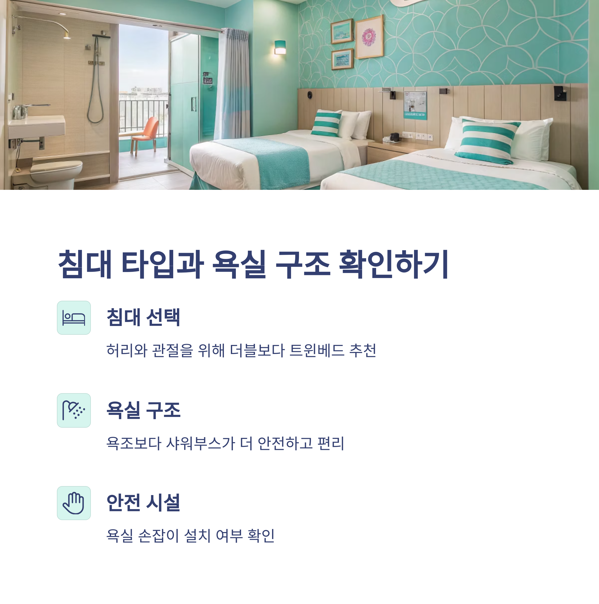 시니어 여행자분들 중에는 허리나 관절이 예민하신 분들 많쥬. 그래서 침대가 너무 낮거나 너무 딱딱하면 다음날 컨디션이 바닥을 칠 수도 있음다. 가능하다면 더블침대보다는 트윈베드, 욕조보다는 샤워부스 형태가 편할 수도 있어요. 욕실에 손잡이가 설치되어 있는지도 함께 체크하면 좋쥬.