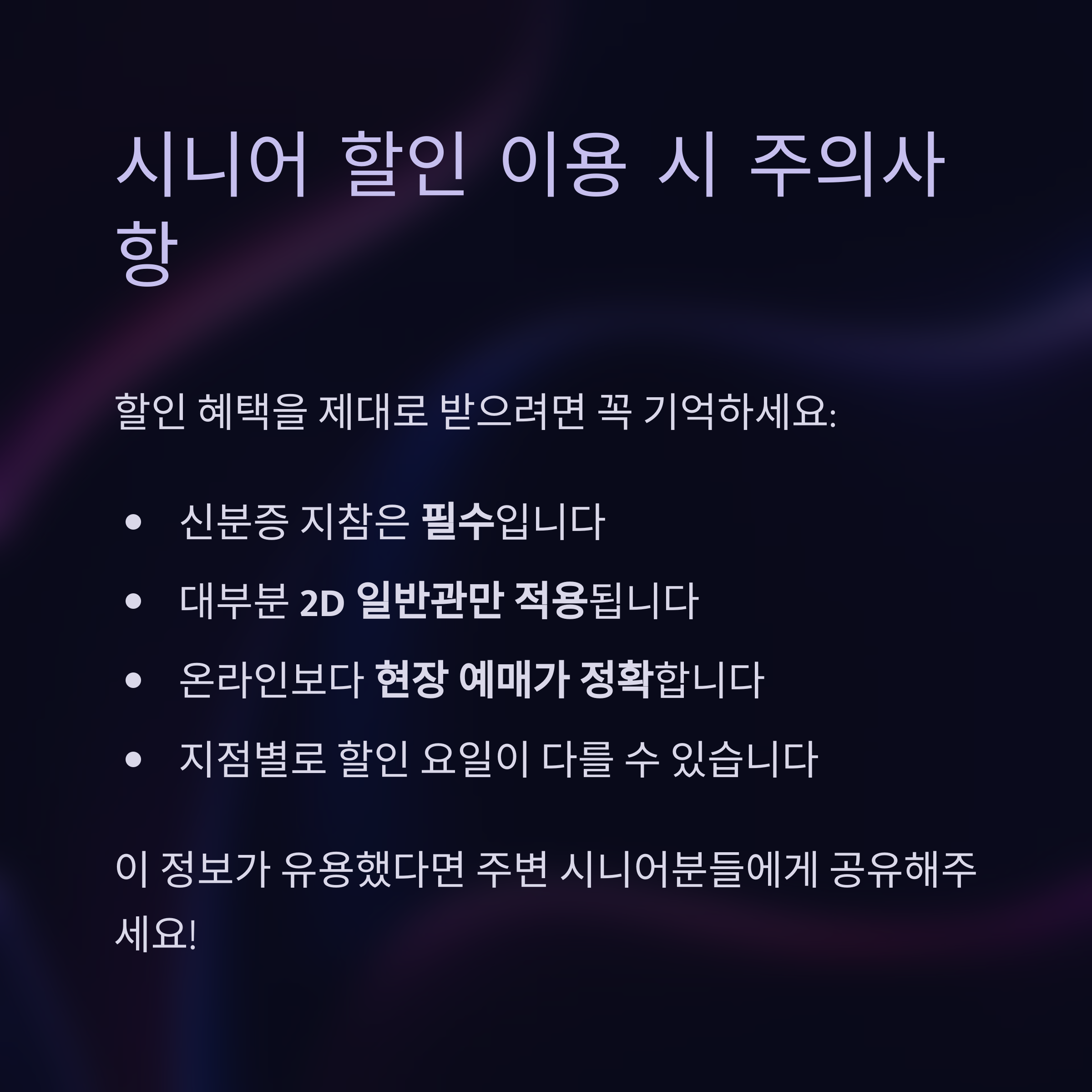 60세 이상이라면 요일별 시니어 할인을 꼭 활용하세요.