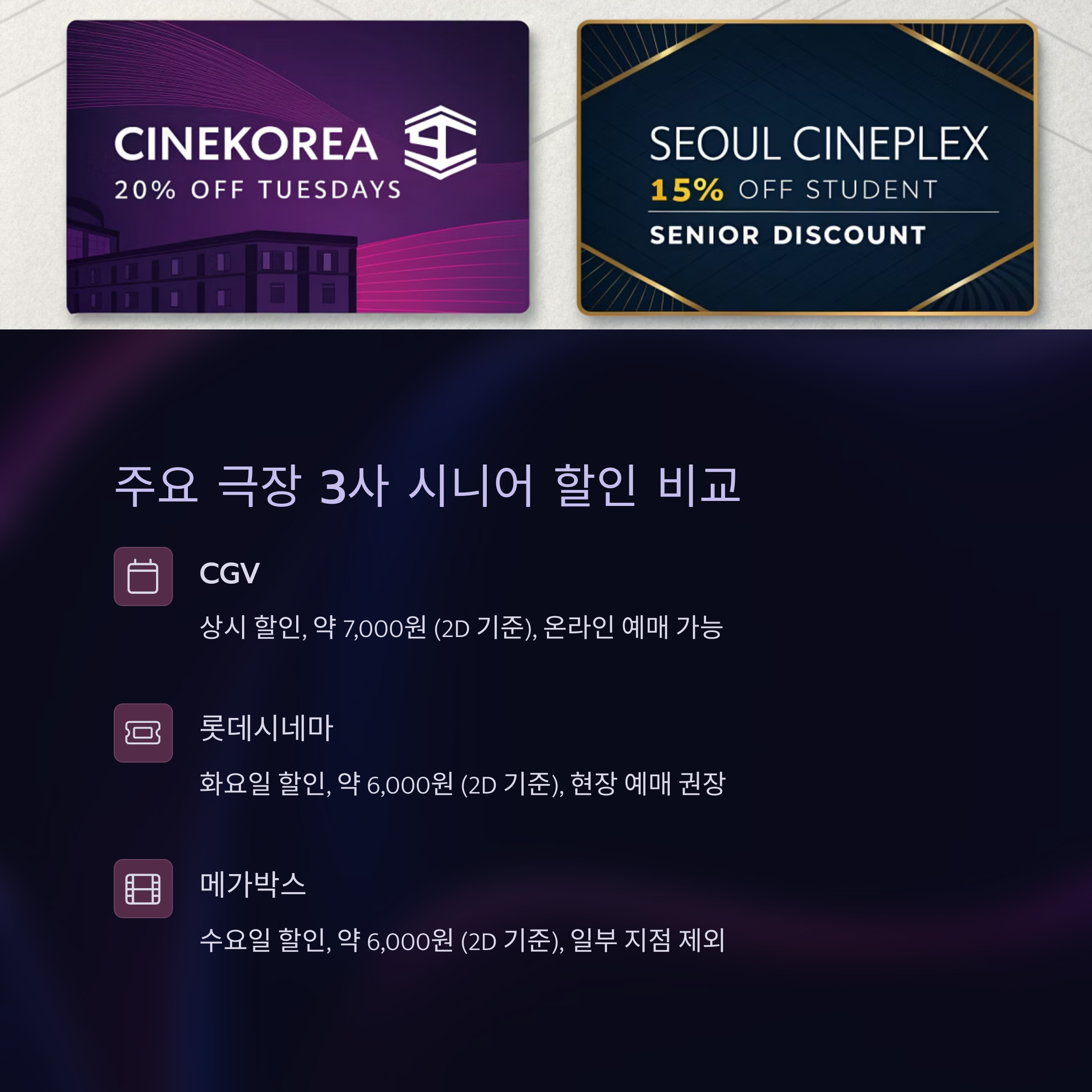 60세 이상 고객을 위한 극장별 할인 요일과 가격 비교 가이드
