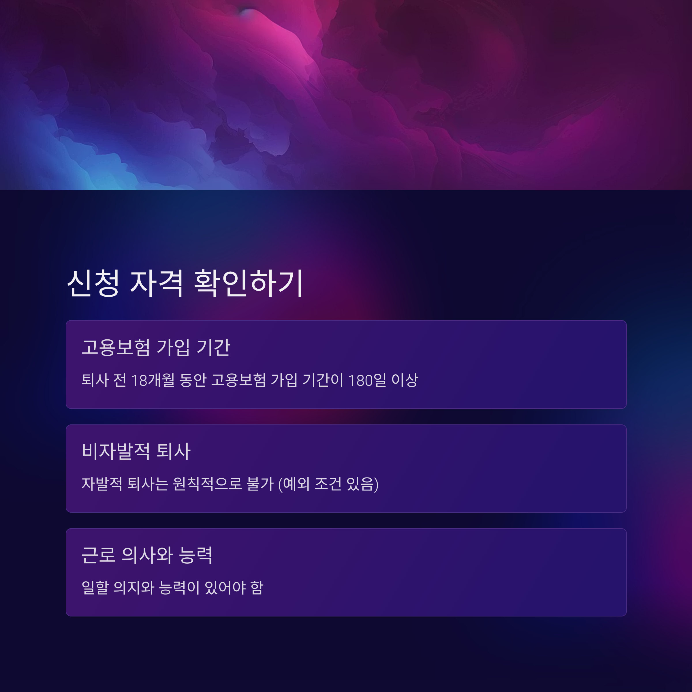 일단 내가 받을 수 있는 사람인지부터 확인해야겠죠. 가장 기본적인 조건은 이렇습니다. 퇴사 전 18개월 동안 고용보험에 가입된 기간이 180일 이상일 것. 비자발적 퇴사일 것. 그리고 ‘근로의사’와 ‘능력’이 있어야 한다는 점. 이 세 가지가 핵심입니다. 여기서 하나라도 안 맞으면 신청이 불가하니, 먼저 체크해야겠지요.