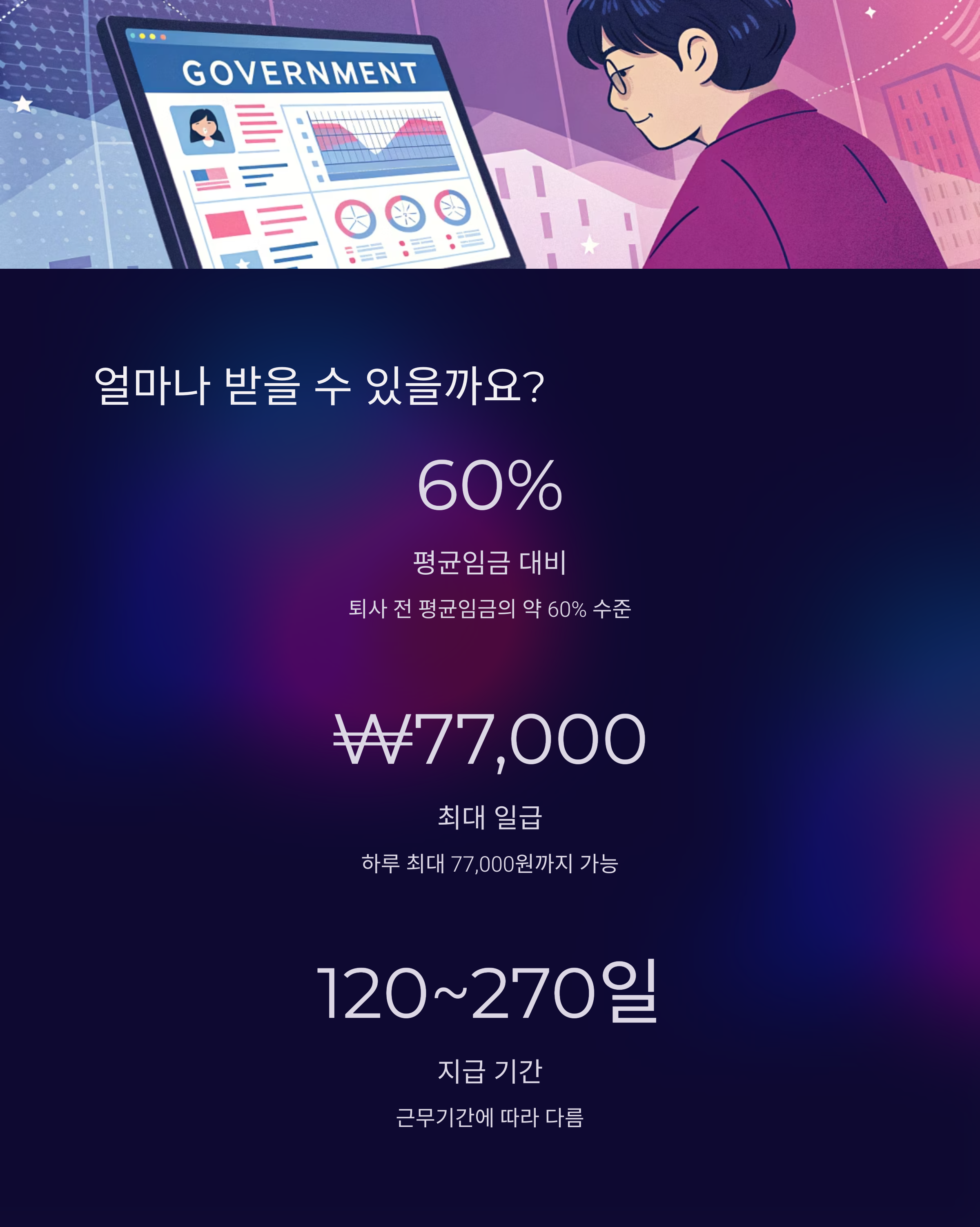 얼마를 얼마나 오래 받느냐는 퇴사 전 평균임금과 근무기간에 따라 다릅니다. 대략 평균임금의 60% 수준에서 계산되며, 최대 1일 77,000원까지 가능합니다. 지급 기간은 최소 120일에서 최대 270일까지 가능하니, 내 상황에 따라 얼마나 받을 수 있을지 꼭 계산해보세요. 고용노동부 홈페이지에 실업급여 모의계산기 기능도 있으니 활용하시면 됩니다.
