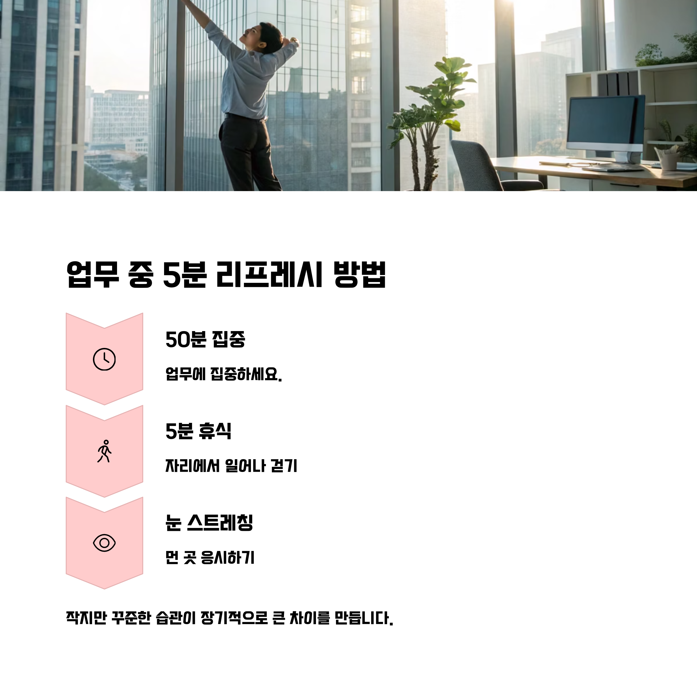 또한, 간단한 손목 회전, 눈 스트레칭을 통해 업무 집중력이 회복됩니다.