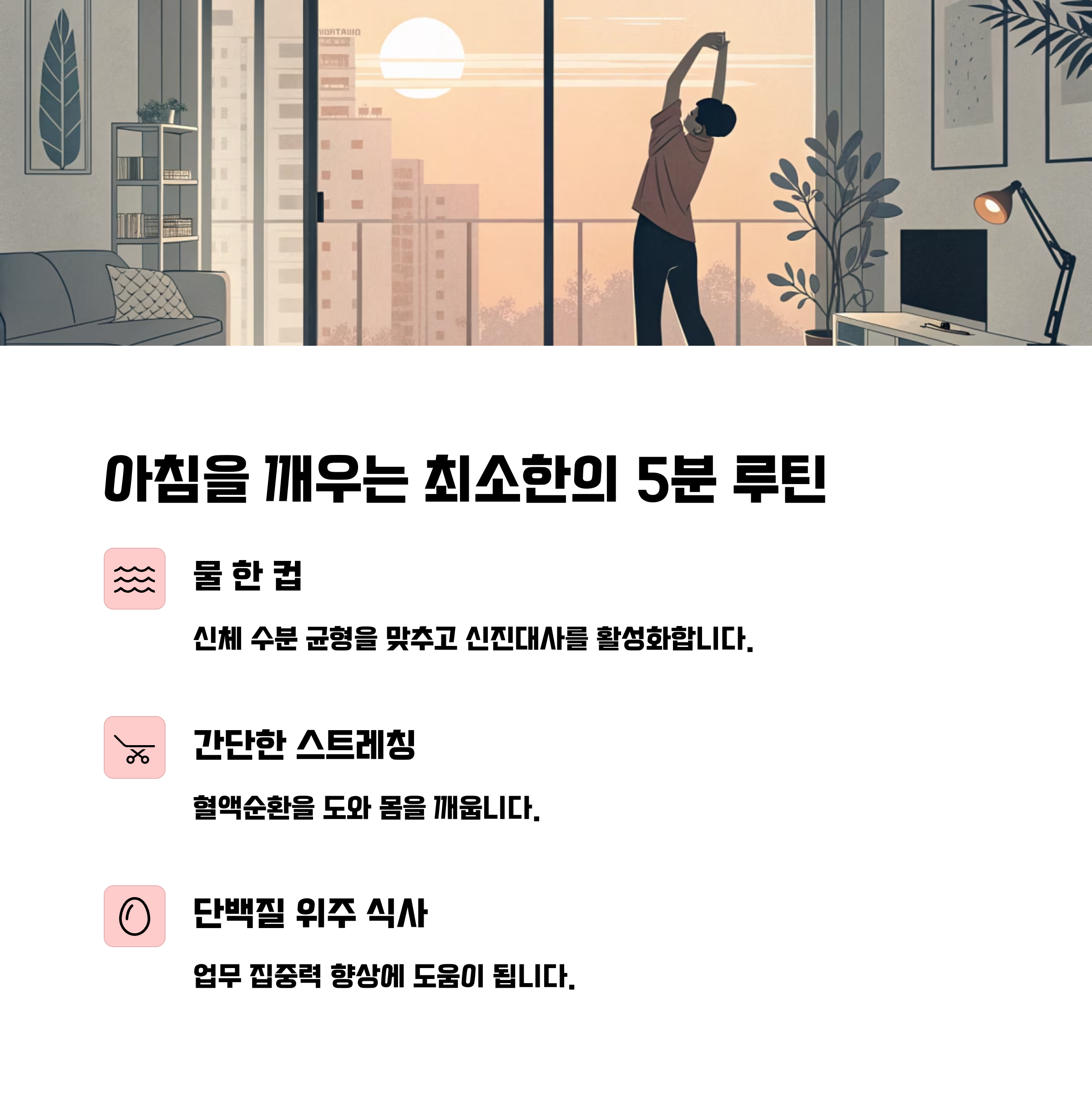 간단한 물 한 컵, 스트레칭, 1분 명상만으로도 하루 에너지의 질이 달라집니다.