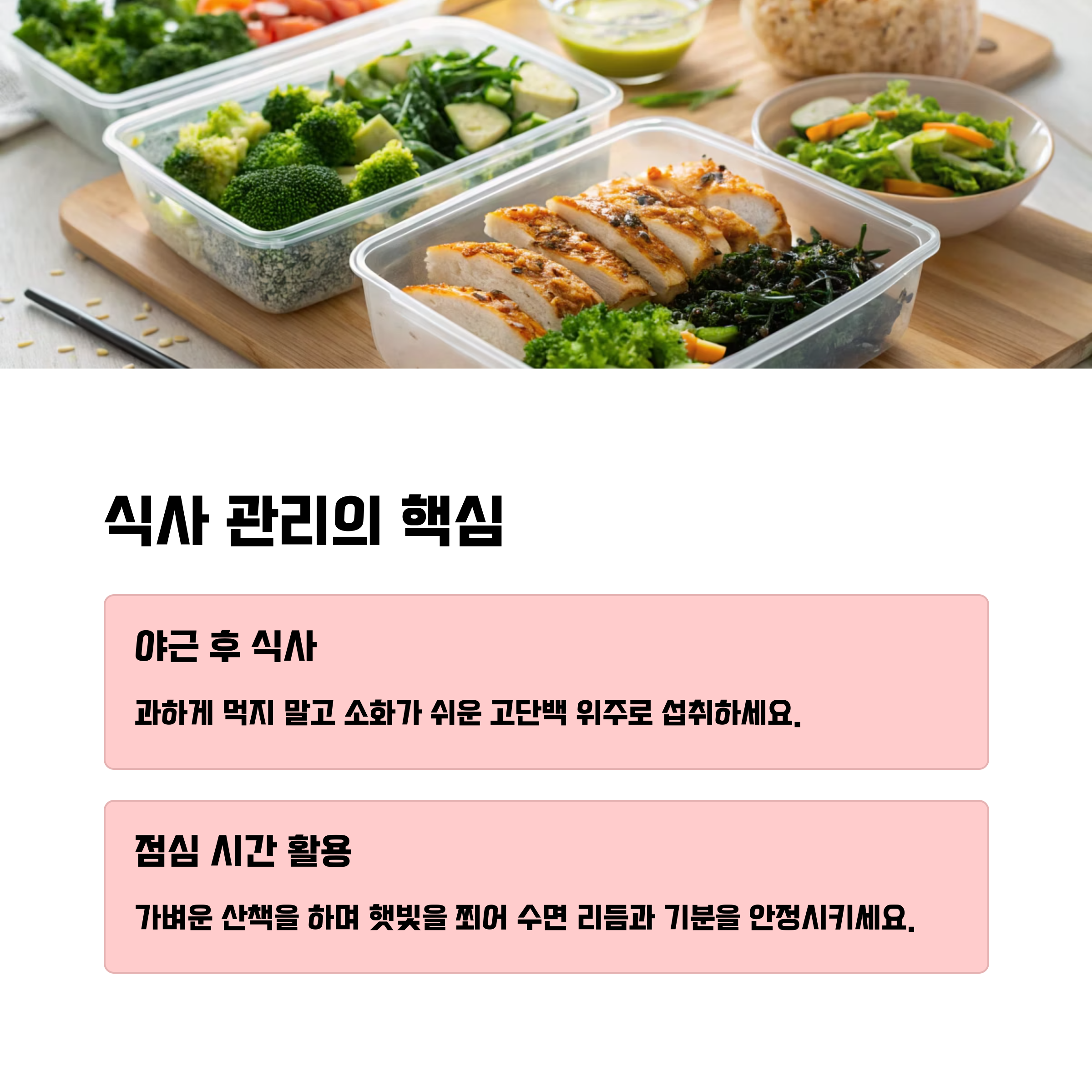 단백질 위주의 간단한 식사라도 반드시 챙기는 것이 중요합니다.