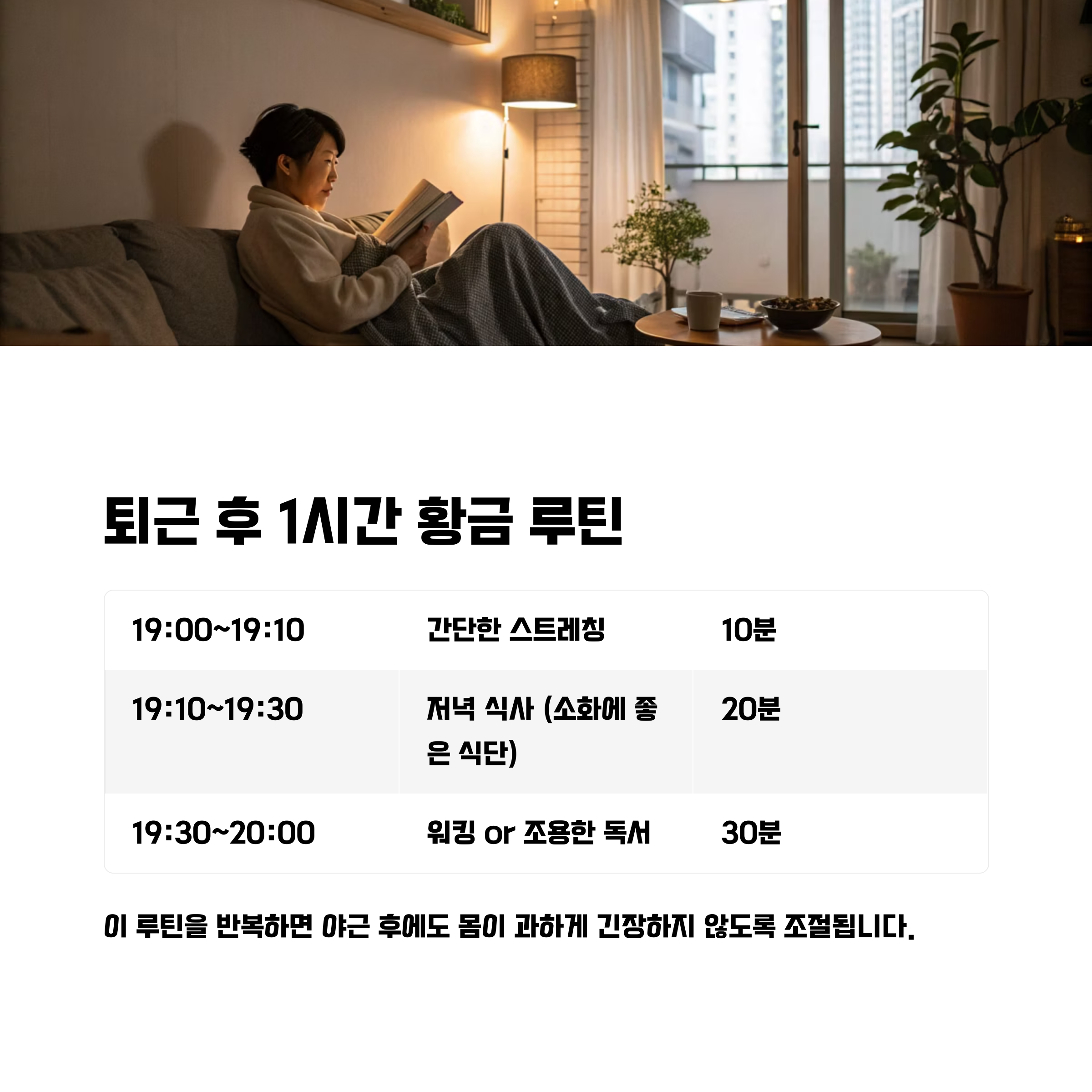 이 루틴을 반복하면 야근 후에도 몸이 과하게 긴장하지 않도록 조절됩니다.