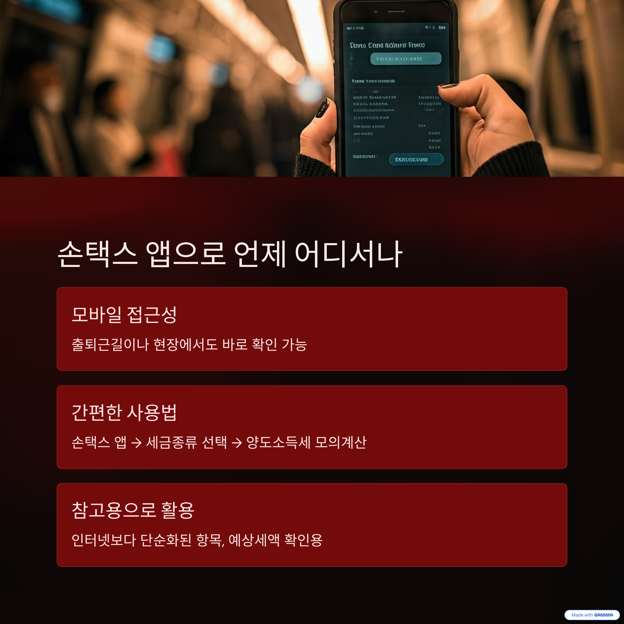 손택스 앱 실행 → 세금종류 선택 → 양도소득세 모의계산 메뉴에서 이용 가능합니다.