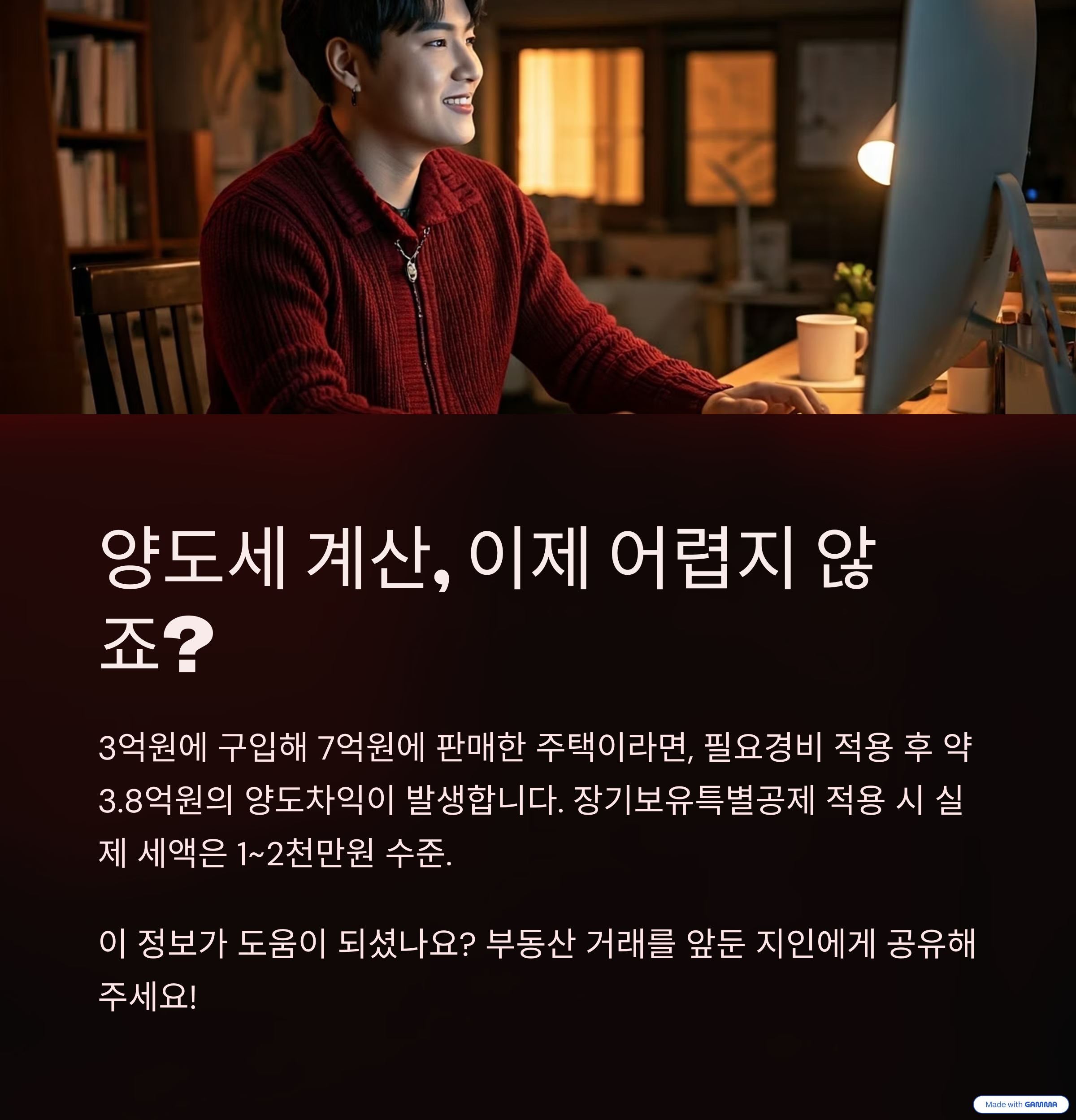 → 장기보유특별공제 및 기본공제를 적용하면, 실제 세액은 약 1천~2천만 원 수준