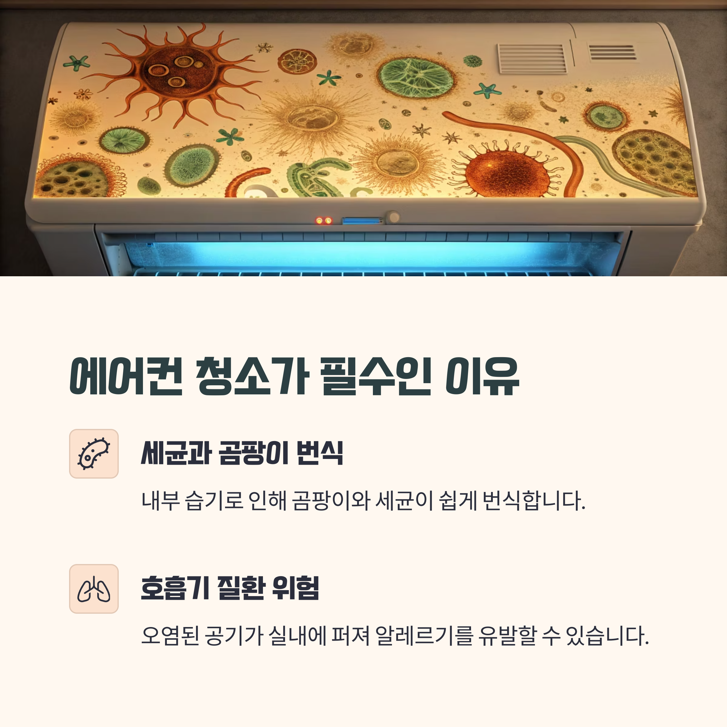 에어컨 내부는 사용하지 않아도 공기 중 먼지, 세균, 곰팡이가 쉽게 쌓이는 구조입니다.