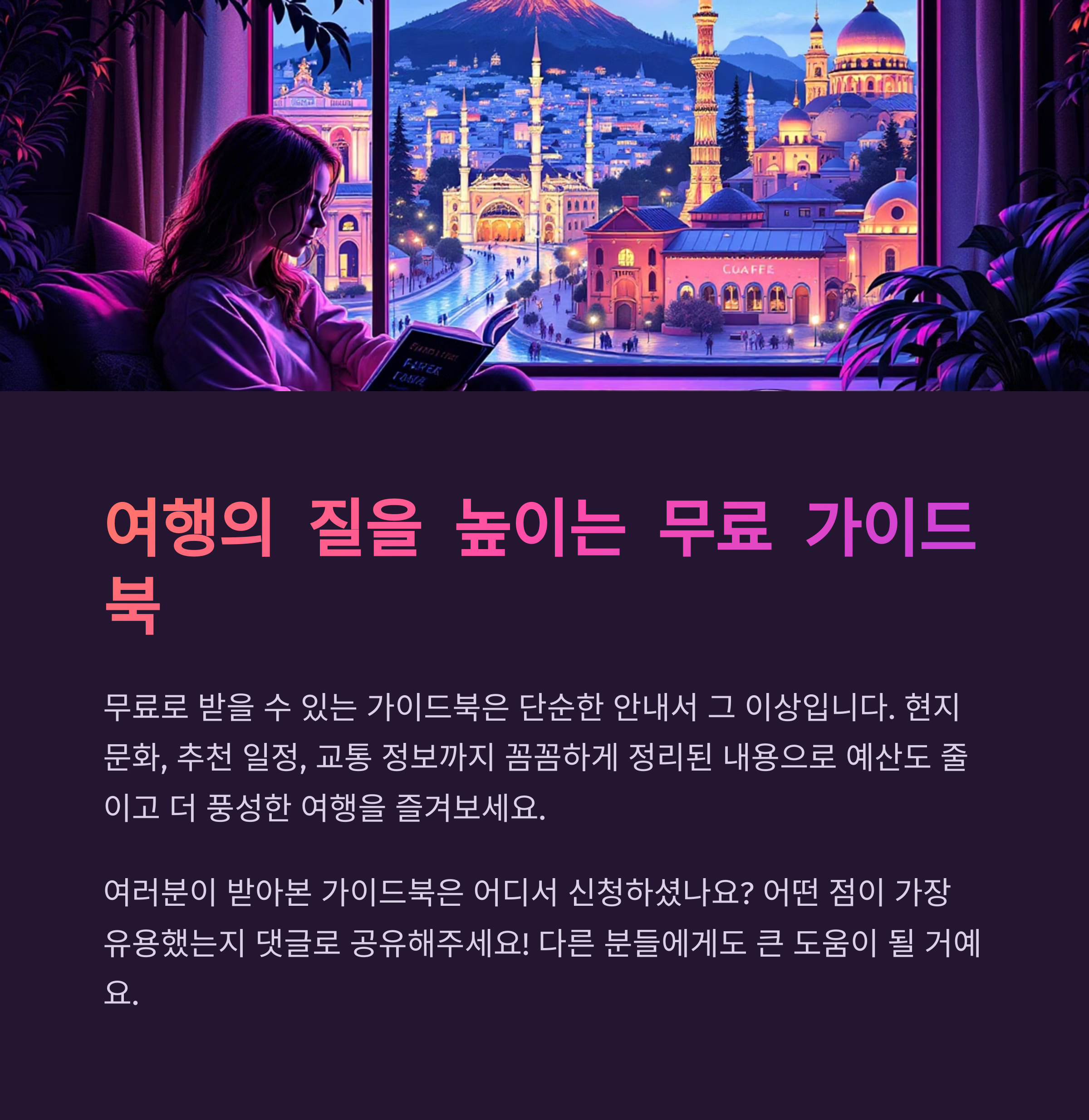 무작정 발 닿는 대로 가는 여행도 좋지만, 기본적인 정보를 머리에 넣고 떠나는 여행은 훨씬 더 여유롭고 풍성하게 느껴집니다. 무료로 받을 수 있는 가이드북은 단순한 안내서 그 이상입니다. 현지의 문화, 추천 일정, 교통까지 꼼꼼하게 정리된 내용을 바탕으로 여행을 구성하면 예산도 줄고, 돌발상황에도 당황하지 않게 됩니다. 꼭 필요한 것만 골라서 참고하면 효율적인 여행 계획을 세우는 데 큰 도움이 됩니다.