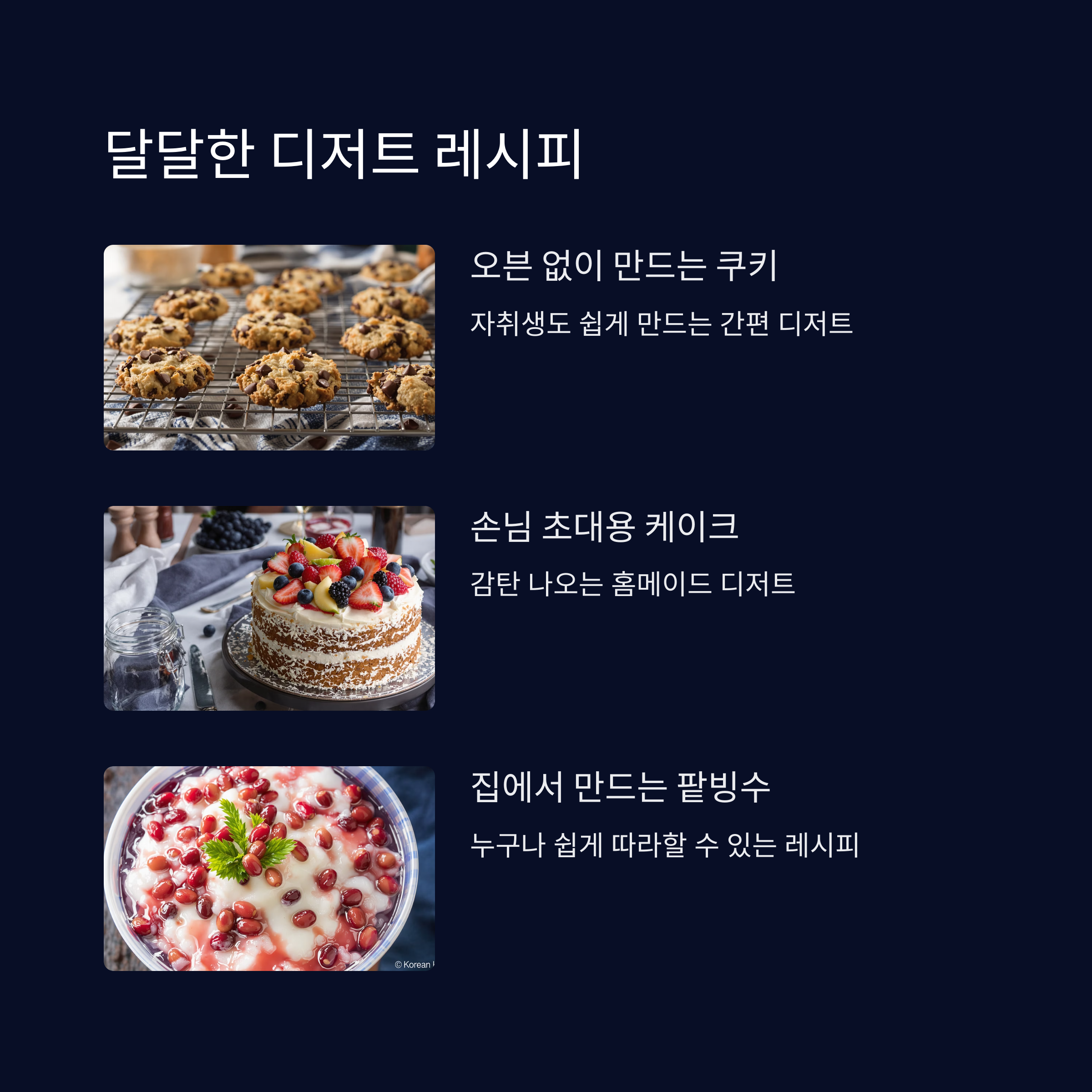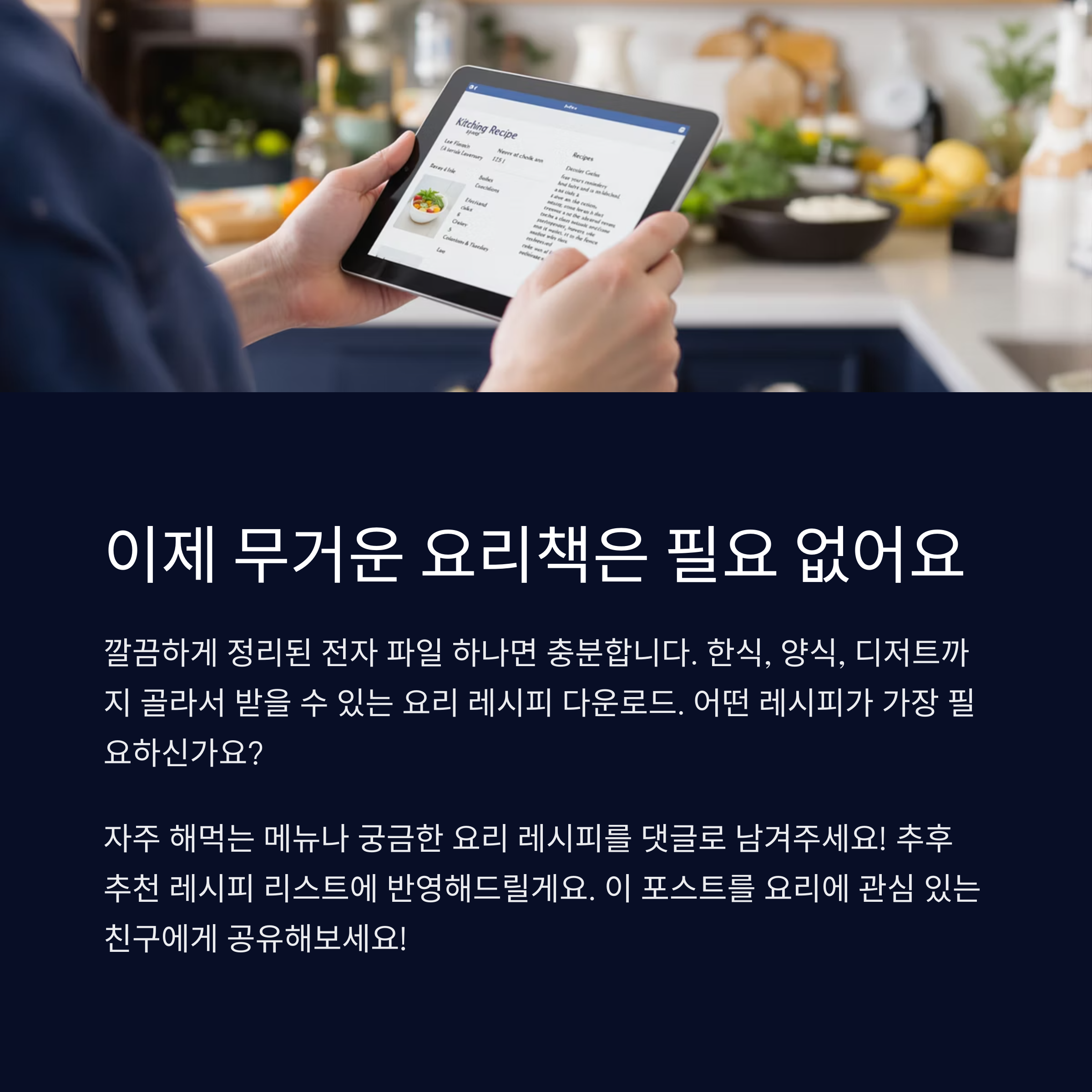 매번 뭐 해먹을지 고민될 때, 레시피 검색해서 보고 또 보고... 그 와중에 재료 안 맞아서 포기하고, 그런 경험 다들 있으시죠? 어떤 날은 반찬 걱정, 어떤 날은 디저트 땡기고. 그런데 한 번에 다 찾을 수 있다면 얼마나 편할까요? 이제 그런 걱정 안 하셔도 됩니다. 요리 초보도 고수도, 간단하게 클릭만 하면 전통 반찬부터 달콤한 디저트까지 레시피를 다운받아볼 수 있으니까요.