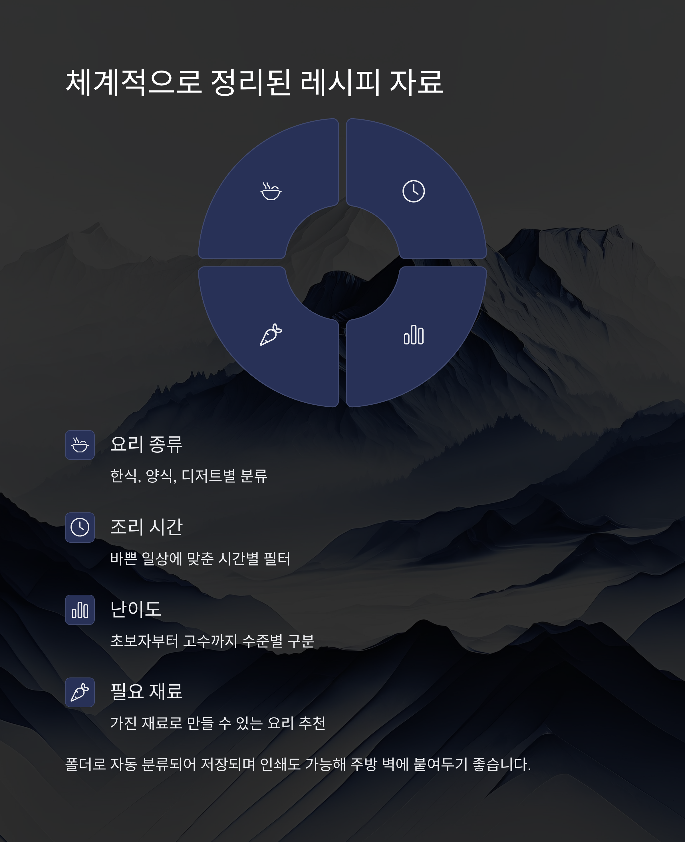 아무리 좋은 레시피여도 찾기 어렵고 정리가 안 돼 있으면 손이 안 가죠. 이 자료들은 요리 종류, 조리 시간, 난이도, 필요 재료 기준으로 필터링 돼 있어서 보기 편하고 찾기 쉬워요. 폴더로 자동 분류돼 저장되니까 언제든 꺼내보기 좋고, 인쇄도 가능해서 주방 벽에 붙여두기에도 제격입니다.