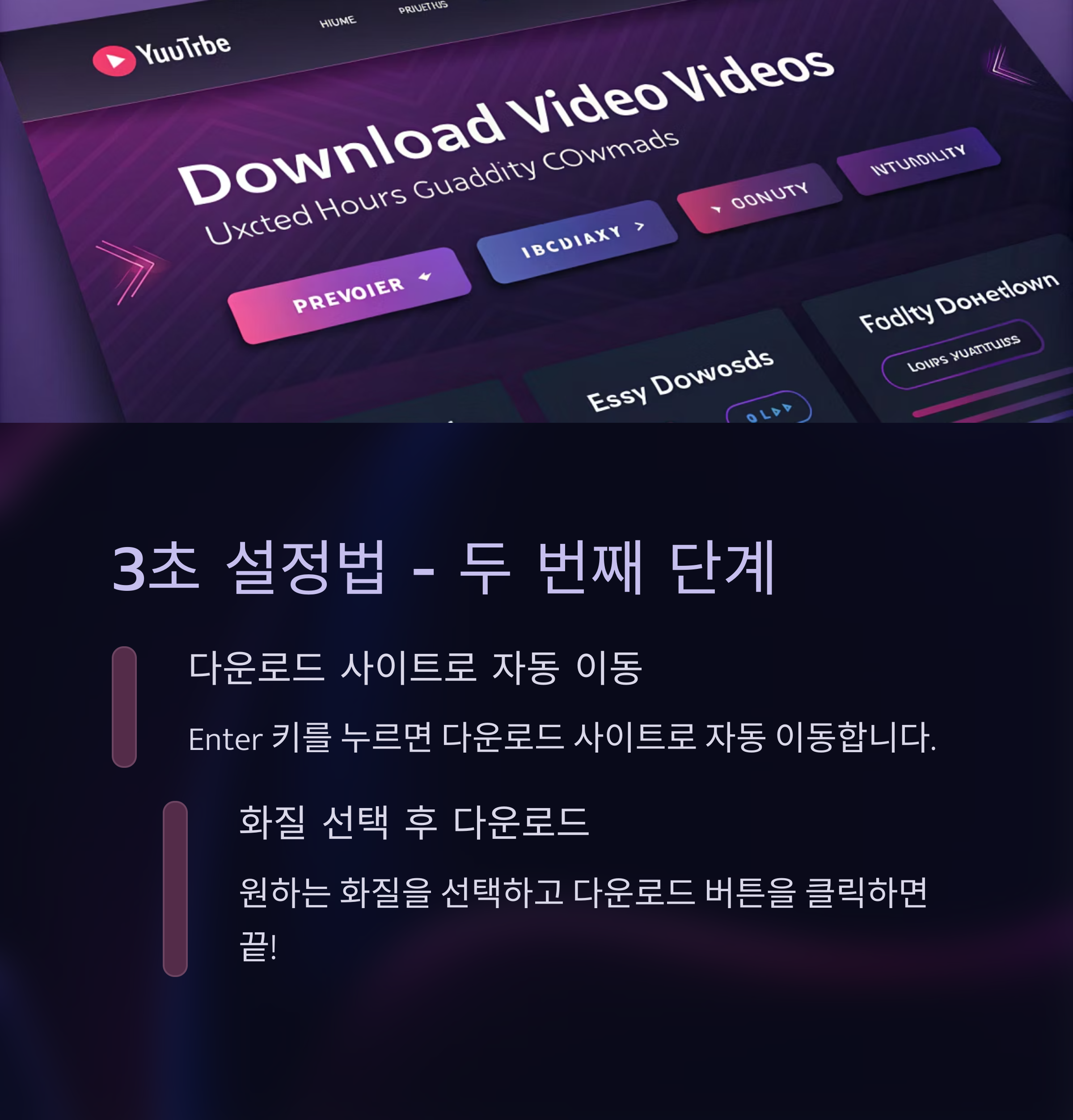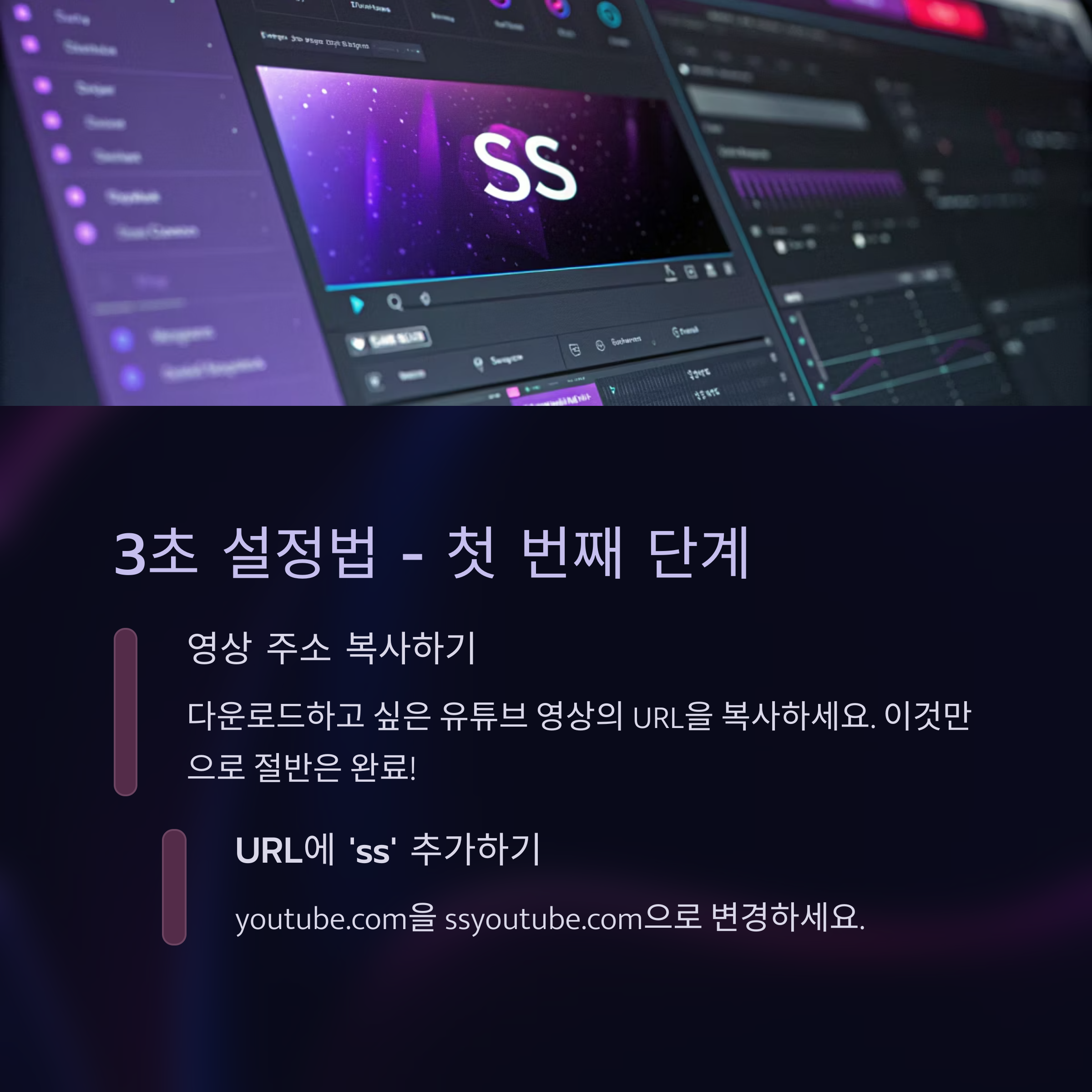 유튜브 주소가 예를 들어 https://www.youtube.com/watch?v=abcd1234라면, 그 중간에 'ss'를 넣어서 https://www.ssyoutube.com/watch?v=abcd1234 이렇게 만들어주세요. 이게 전부입니다.