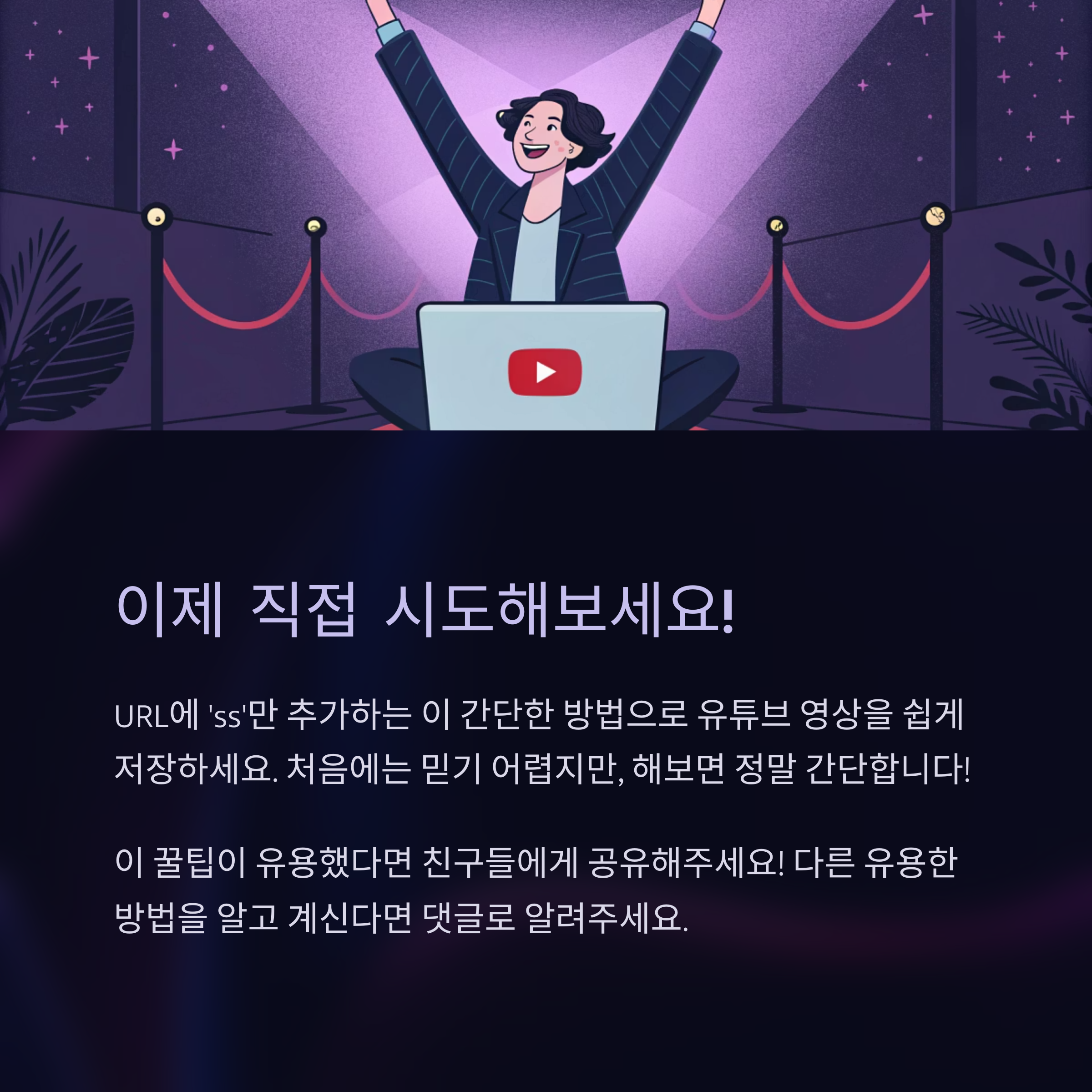 복잡한 설명도, 어려운 기술도 필요 없이 URL에 'ss'만 넣으면 유튜브 영상 저장 끝. 처음엔 반신반의했지만, 막상 해보면 이게 뭐라고 싶을 정도로 쉬워요. 저장하고 싶은 영상 있을 때 한 번만 시도해보세요.