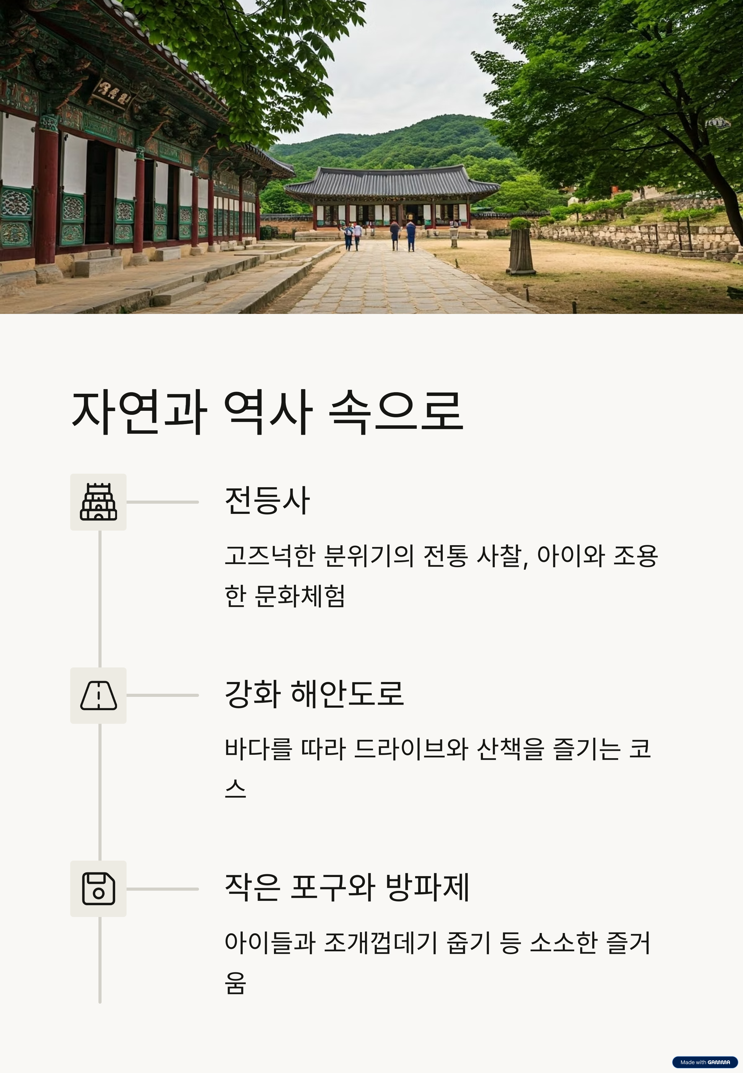 | 13:30~15:00 | 전등사 산책 또는 해안도로 드라이브 |