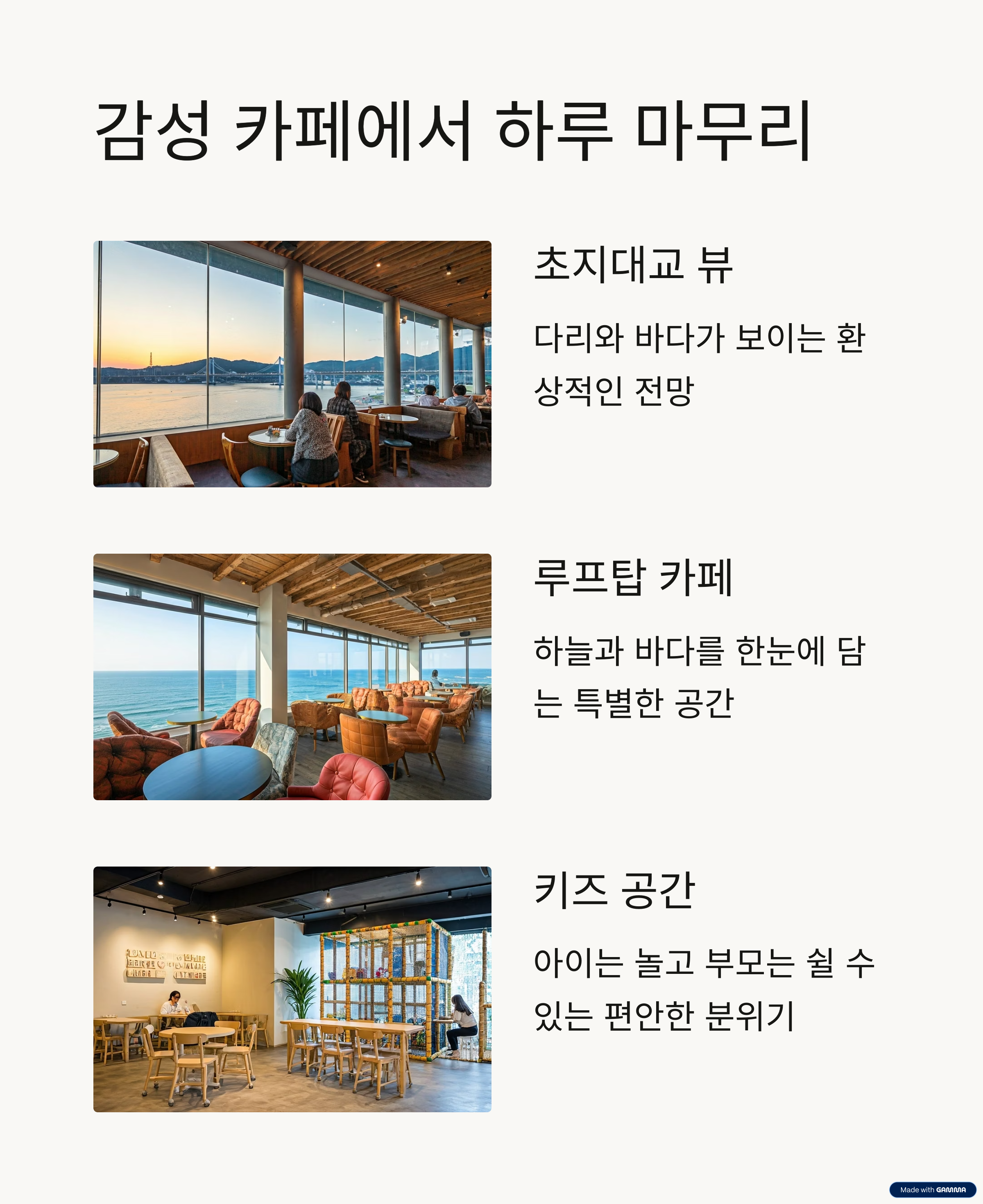 대부분 바다 뷰, 루프탑, 키즈 공간이 마련된 곳이 많아