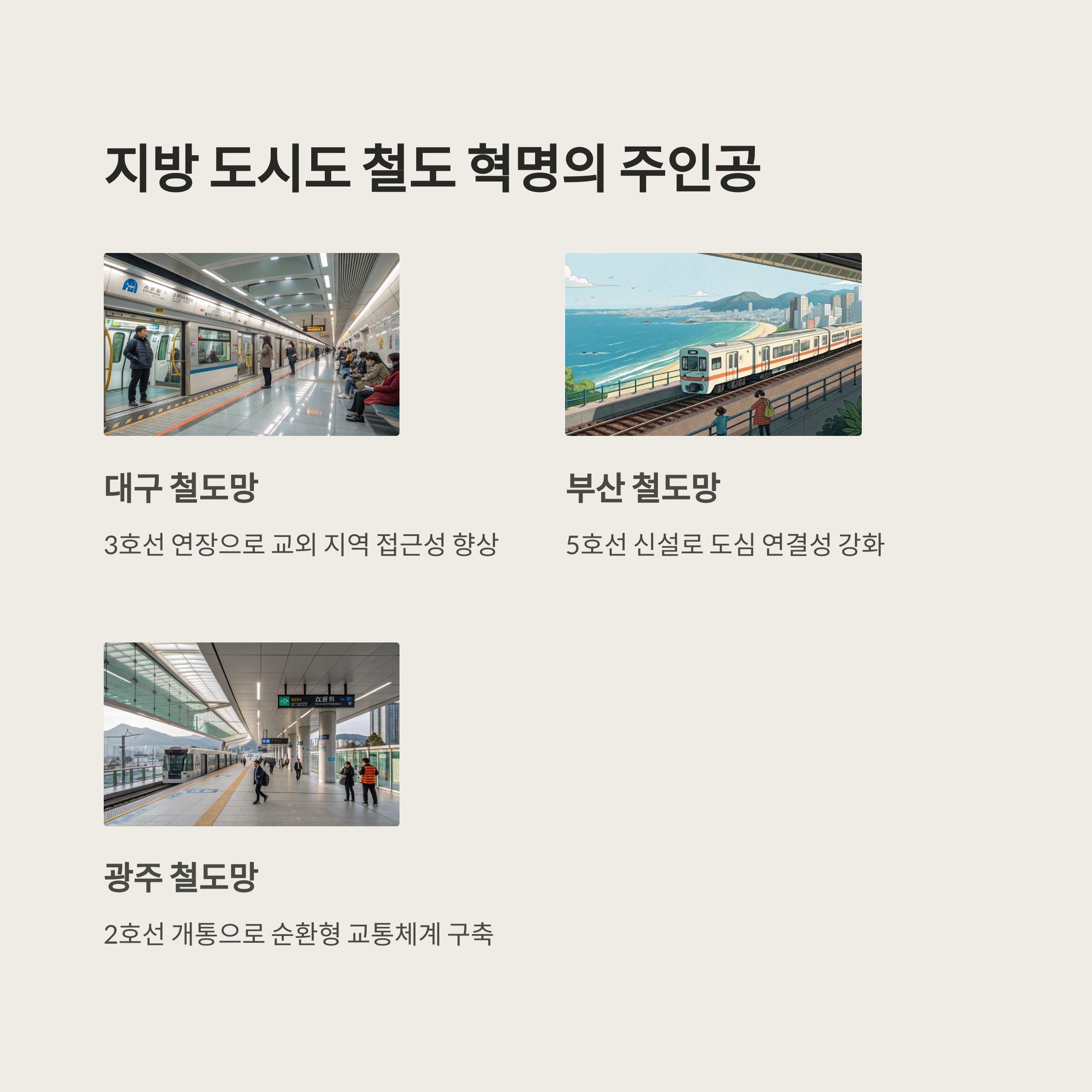 | GTX A, B, C / 4호선 진접, 5·9호선 연장 | 대구 화원선, 부산 하단선, 광주 2호선 | 대부분 2025년~2028년 사이 순차 개통 예정 |