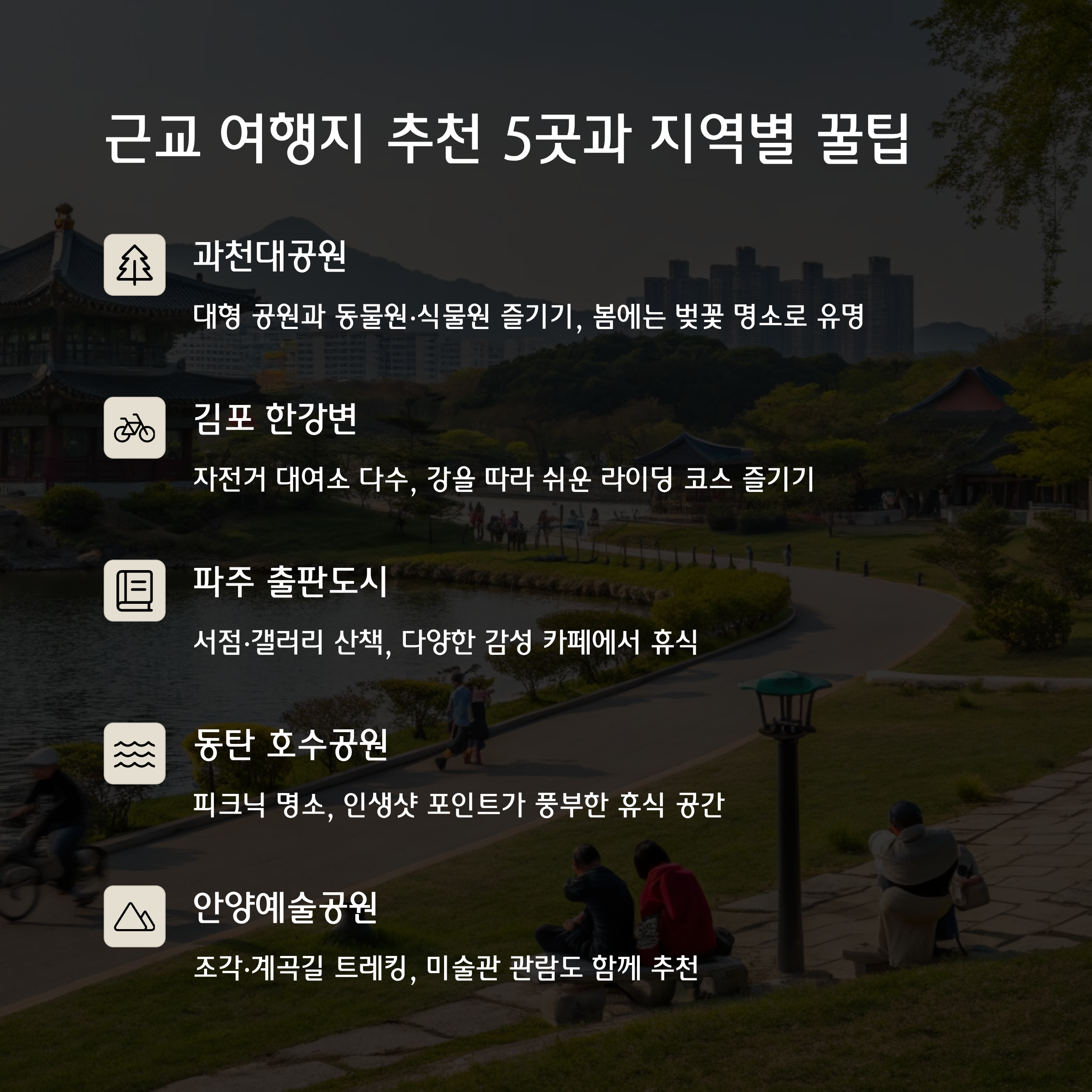 그럼요! 파주 출판도시나 안양 예술공원은 혼자만의 시간을 갖기 딱 좋은 곳이에요. 독서나 사색 좋아하신다면 강추!