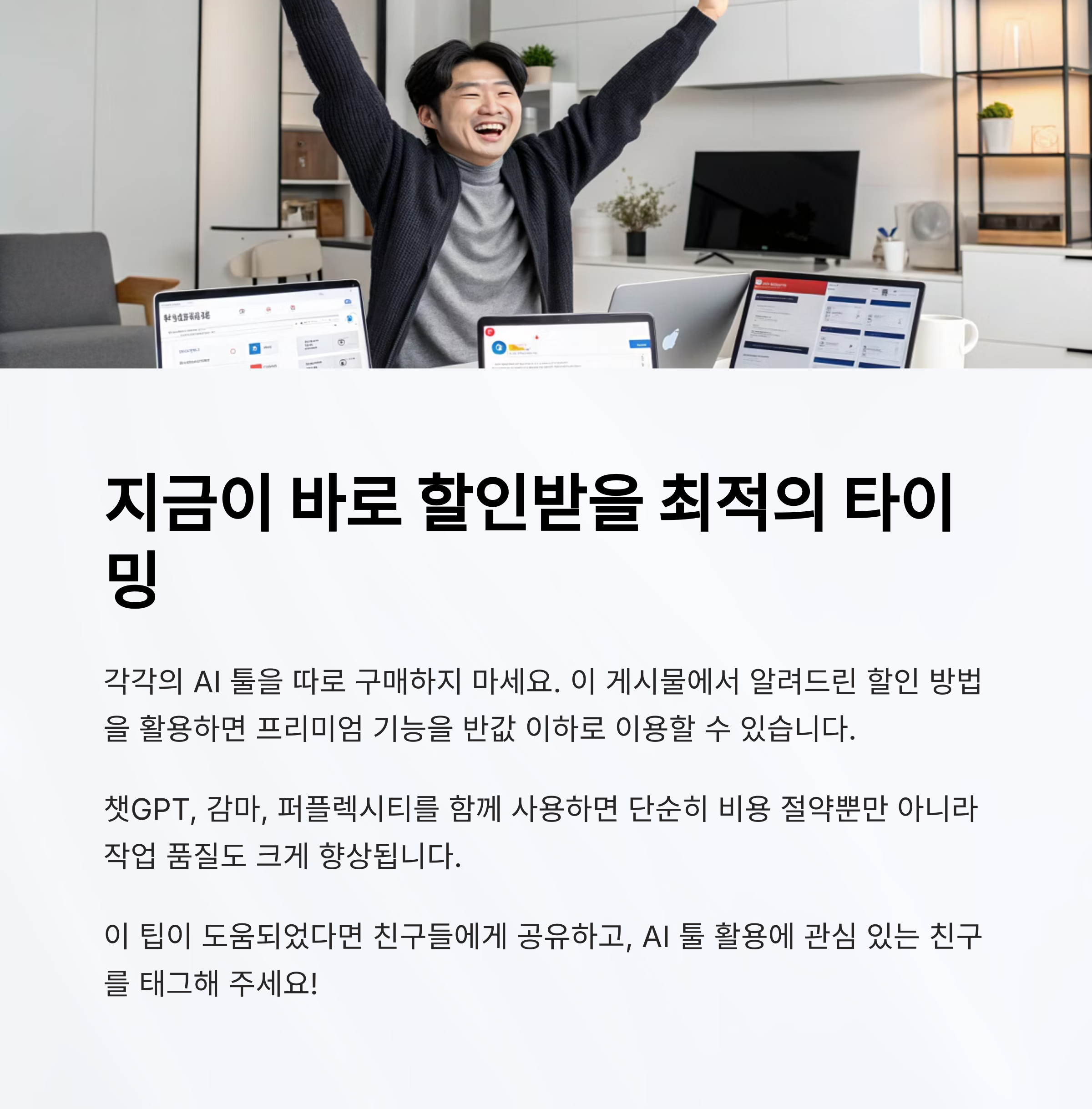 최근 챗GPT를 포함한 다양한 생성형 AI 툴들이 등장하면서 업무 효율이 확실히 달라졌습니다. 하지만 유료 플랜으로 넘어가려는 순간 고민이 시작됩니다. 비싸다는 느낌은 아닌데 매달 나가는 비용이 부담될 때가 있죠. 그런데 이 툴들을 훨씬 저렴하게, 심지어 반값 이하로 쓸 수 있는 방법이 있다는 사실, 알고 계셨나요? 이번 글에서는 챗GPT, 감마, 퍼블릭시티 세 가지 주요 툴의 실속 할인 정보를 정리해 알려드릴게요.