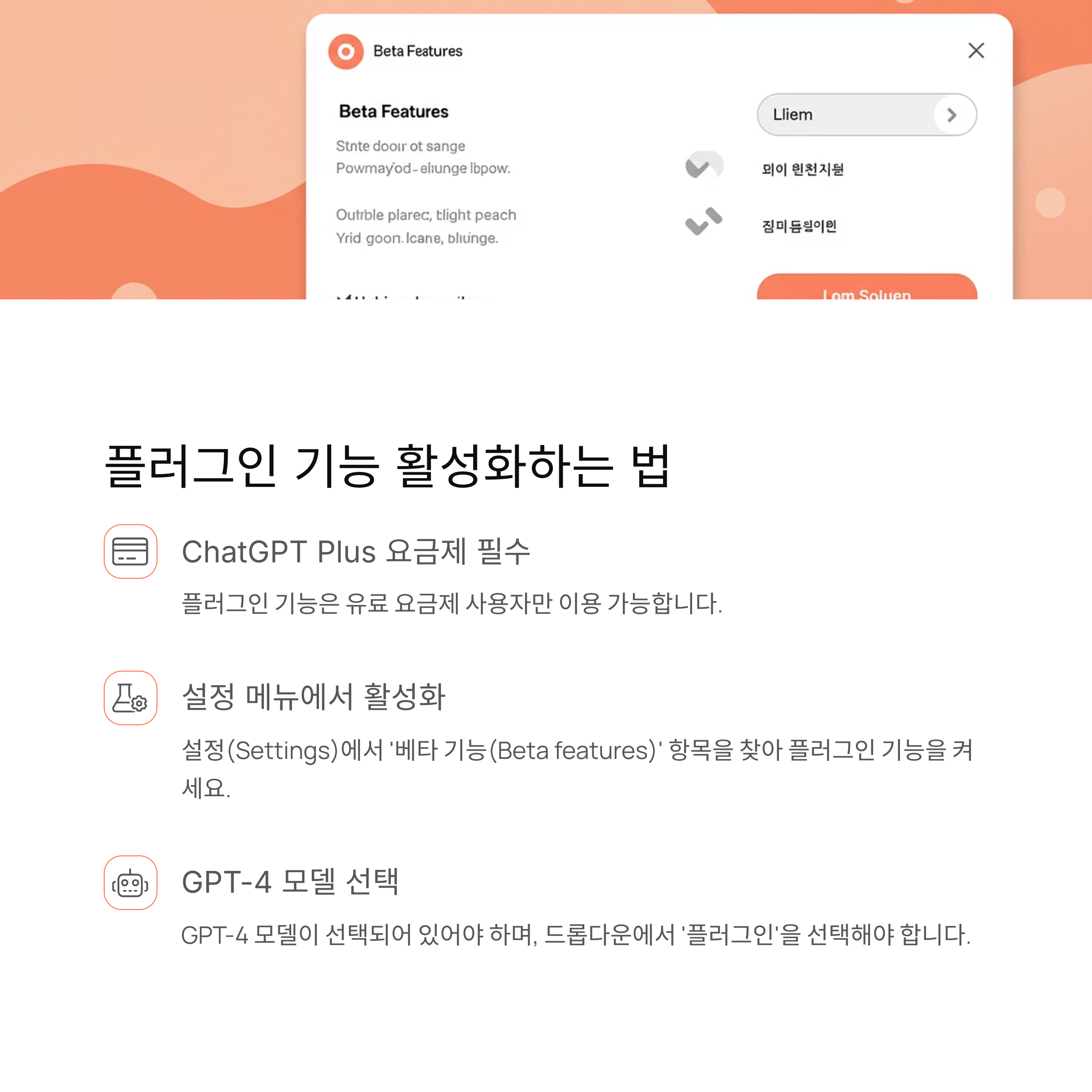 우선 챗GPT의 플러그인 기능은 유료 요금제 사용자만 사용할 수 있습니다. ChatGPT Plus 요금제를 이용 중이라면, 설정(Settings) 메뉴에서 '베타 기능(Beta features)' 항목을 찾아 플러그인 항목을 활성화해주면 됩니다. 이때 GPT-4 모델이 선택되어 있어야 하며, GPT-4 우측의 드롭다운에서 ‘플러그인’을 선택해야 합니다.