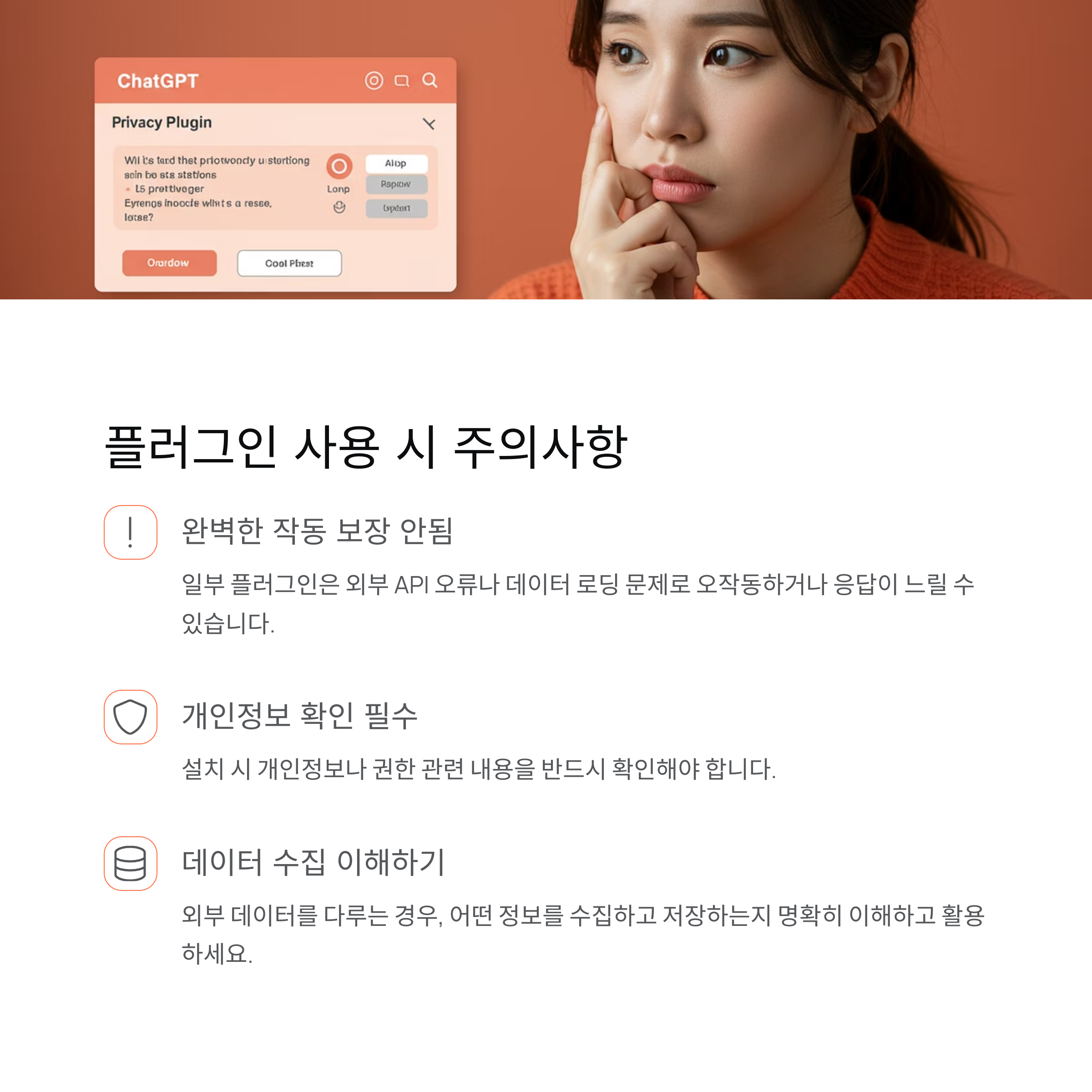 모든 플러그인이 완벽하게 작동하는 것은 아닙니다. 일부 플러그인은 외부 API 오류나 데이터 로딩 문제로 인해 오작동하거나 응답이 느릴 수 있습니다. 또한 설치 시 개인정보나 권한 관련 내용을 잘 확인해야 합니다. 특히 외부 데이터를 다루는 경우, 어떤 정보를 수집하고 저장하는지 명확히 이해하고 활용하는 것이 좋습니다.