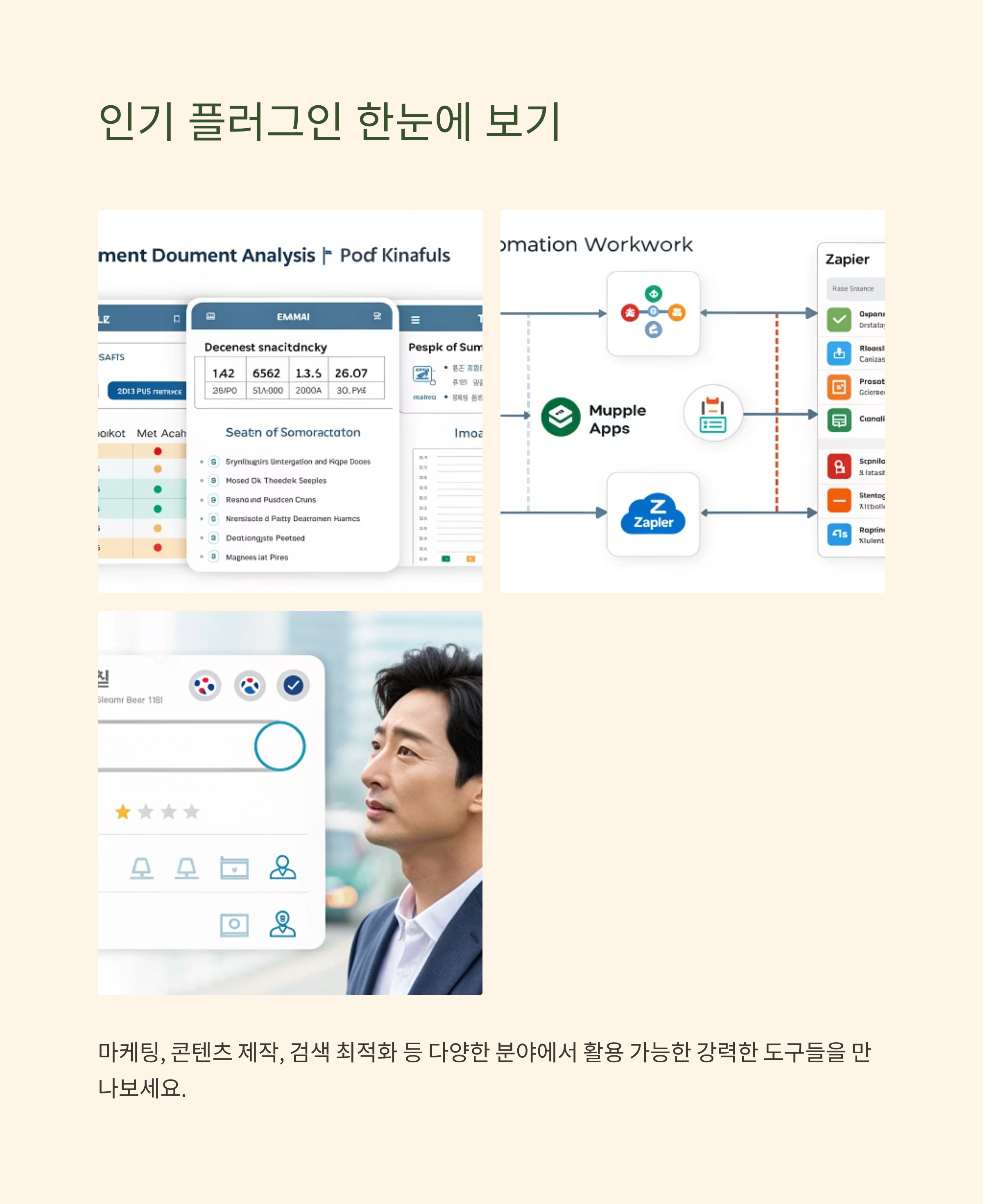 대표적으로 추천되는 플러그인은 Web Browser, AskYourPDF, Wolfram, Zapier 등이 있습니다. 예를 들어 Web Browser는 최신 웹사이트 정보를 바로 가져올 수 있어 뉴스 요약, 시세 분석에 유용하고, AskYourPDF는 PDF 문서를 직접 읽고 분석해주는 기능이 있어 리서치나 논문 분석 시 큰 도움을 줍니다. 단순 자동화가 아닌 고도화된 AI 도구 활용으로 접근하시면 좋습니다.